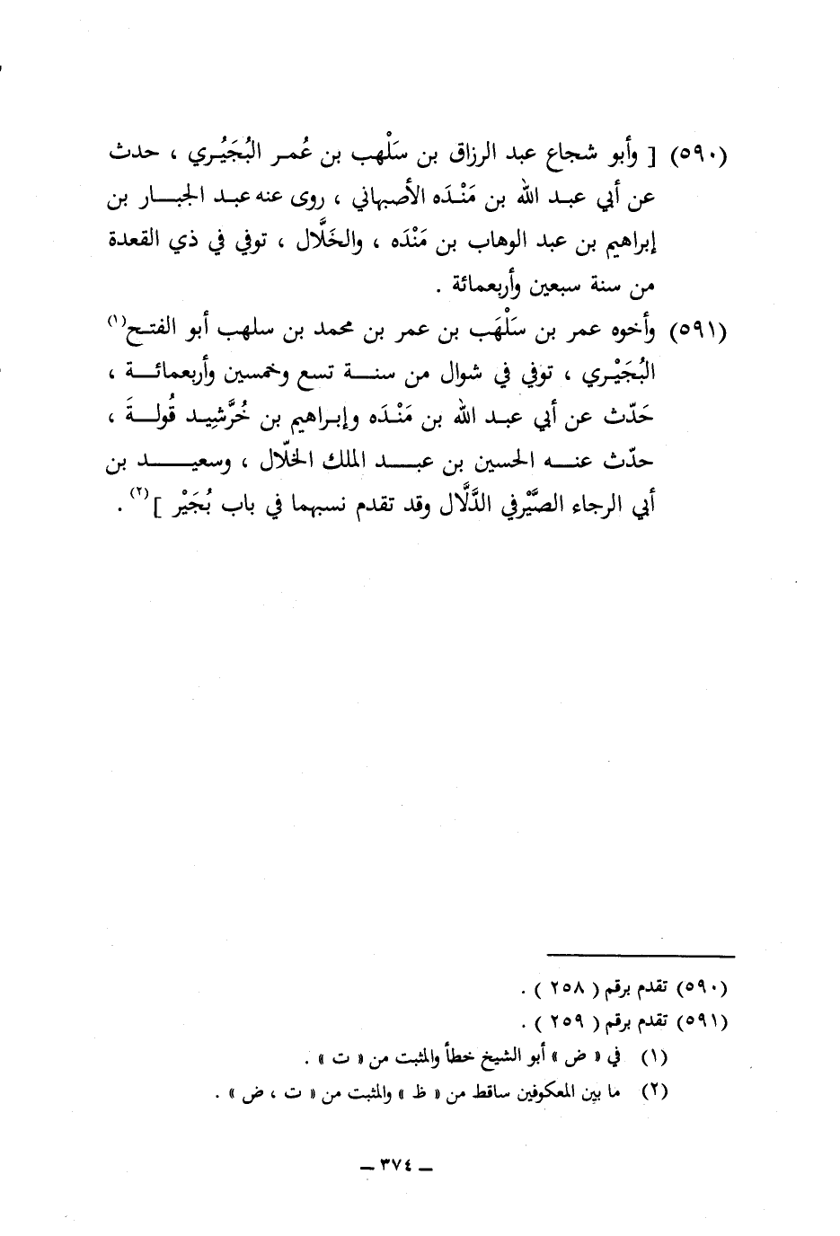 590 - وَأَبُو شُجَاع عبد الرَّزَّاق بن سلهب بن عمر البجيري حدث عَن ابي عبد الله بن مَنْدَه الْأَصْبَهَانِيّ روى عَنهُ عبد الْجَبَّار بن إِبْرَاهِيم بن عبد الْوَهَّاب بن مَنْدَه والخلال توفّي فِي ذِي الْقعدَة من سنة سبعين وَأَرْبَعمِائَة