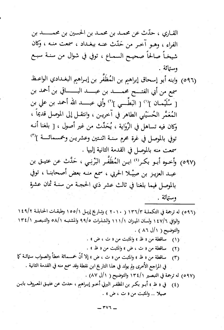 596 - وإبنه أَبُو إِسْحَاق إِبْرَاهِيم بن المظفر بن إِبْرَاهِيم الْبَغْدَادِيّ الْوَاعِظ سمع من أبي الْفَتْح مُحَمَّد بن عبد الْبَاقِي بن أَحْمد بن سُلَيْمَان البطي وابي عبد الله أَحْمد بن عَليّ بن المعمر الْحُسَيْنِي الطَّاهِر فِي آخَرين وانتقل إِلَى الْموصل قَدِيما وَكَانَ فِيهِ تساهل فِي الرِّوَايَة يحدث فِي غير أصُول بلغنَا أَنه توفّي بالموصل فِي غرَّة محرم سنة اثْنَتَيْنِ وَعشْرين وَخَمْسمِائة سَمِعت مِنْهُ بالموصل فِي القدمة الثَّانِيَة إِلَيْهَا