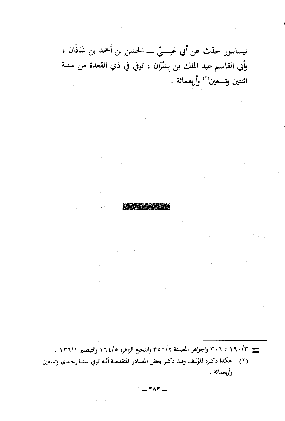 نيسابور حدث عَن أبي عَليّ الْحسن بن أَحْمد بن شَاذان وابي الْقَاسِم عبد الْملك بن شبران توفّي فِي ذِي الْقعدَة من سنة اثْنَتَيْنِ وَتِسْعين وَأَرْبَعمِائَة