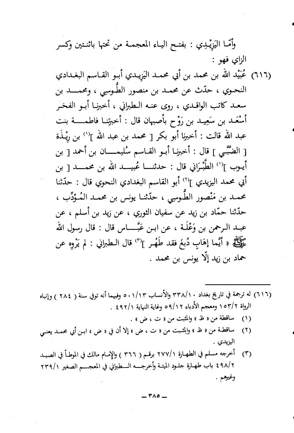 616 - عبيد الله بن مُحَمَّد بن أبي مُحَمَّد اليزيدي أَبُو الْقَاسِم الْبَغْدَادِيّ النَّحْوِيّ حدث عَن مُحَمَّد بن مَنْصُور الطوسي وَمُحَمّد بن سعد كَاتب الْوَاقِدِيّ روى عَنهُ الطَّبَرَانِيّ أخبرنَا أَبُو الْفَخر أسعد بن سعيد بن روح بأصبهان قَالَ أخبرتنا فَاطِمَة بنت عبد الله قَالَت أخبرنَا أَبُو بكر مُحَمَّد بن عبد الله بن ريذة الضَّبِّيّ قَالَ أخبرنَا أَبُو الْقَاسِم سُلَيْمَان بن أَحْمد بن أَيُّوب الطَّبَرَانِيّ قَالَ حَدثنَا عبيد الله بن مُحَمَّد بن أبي مُحَمَّد اليزيدي أَبُو الْقَاسِم الْبَغْدَادِيّ النَّحْوِيّ قَالَ حَدثنَا مُحَمَّد بن مَنْصُور الطوسي حَدثنَا يُونُس بن مُحَمَّد الْمُؤَدب حَدثنَا حَمَّاد بن زيد عَن سُفْيَان الثَّوْريّ عَن زيد بن أسلم عَن عبد الرَّحْمَن بن وَعلة عَن ابْن عَبَّاس قَالَ قَالَ رَسُول الله صلى الله عَلَيْهِ وَسلم أَيّمَا إهَاب دبغ فقد طهر قَالَ الطَّبَرَانِيّ لم يروه عَن حَمَّاد بن زيد إِلَّا يُونُس بن مُحَمَّد