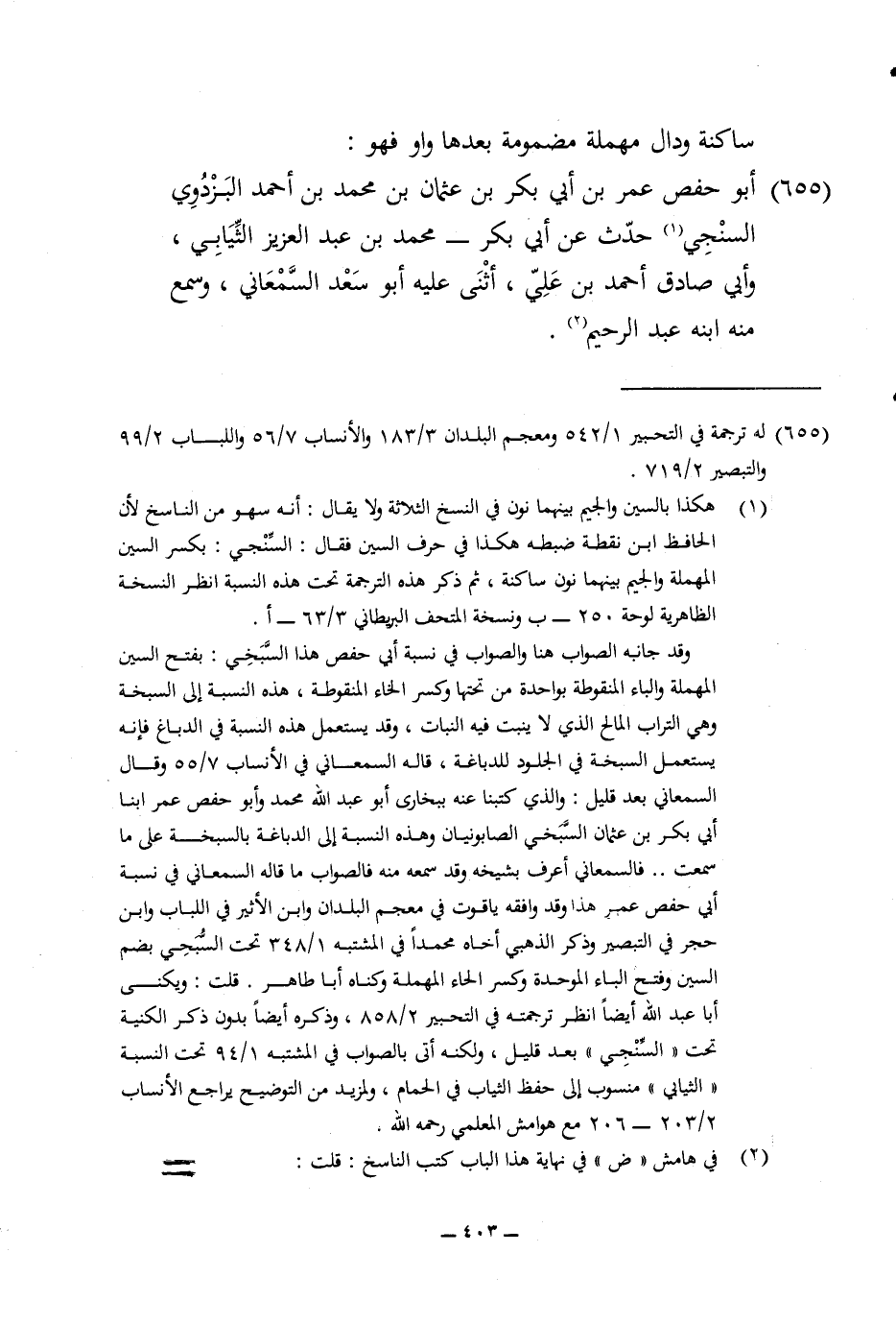 655 - أَبُو حَفْص عمر بن أبي بكر بن عُثْمَان بن مُحَمَّد بن أَحْمد الْبَزْدَوِيّ السنجي حدث عَن أبي بكر مُحَمَّد بن عبد الْعَزِيز الثيابي وابي صَادِق أَحْمد بن عَليّ أثنى عَلَيْهِ أَبُو سعد السَّمْعَانِيّ وَسمع مِنْهُ ابْنه عبد الرَّحِيم