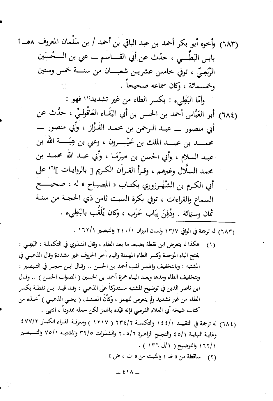 684 - أَبُو الْعَبَّاس أَحْمد بن الْحسن بن ابي الْبَقَاء العاقولي حدث عَن أبي مَنْصُور عبد الرَّحْمَن بن مُحَمَّد الْقَزاز وَأبي مَنْصُور مُحَمَّد بن عبد الْملك بن خيرون وَعلي بن هبة الله بن عبد السَّلَام وابي الْحسن بن صرما وَأبي عبد الله مُحَمَّد بن مُحَمَّد السلال وَغَيرهم وَقَرَأَ الْقُرْآن الْكَرِيم بالروايات على أبي الْكَرم بن الشهرزوري بِكِتَاب الْمِصْبَاح لَهُ صَحِيح السماع والقراءات توفّي بكرَة السبت ثامن ذِي الْحجَّة من سنة ثَمَان وسِتمِائَة وَدفن بِبَاب حَرْب وَكَانَ يلقب بالبطيء
