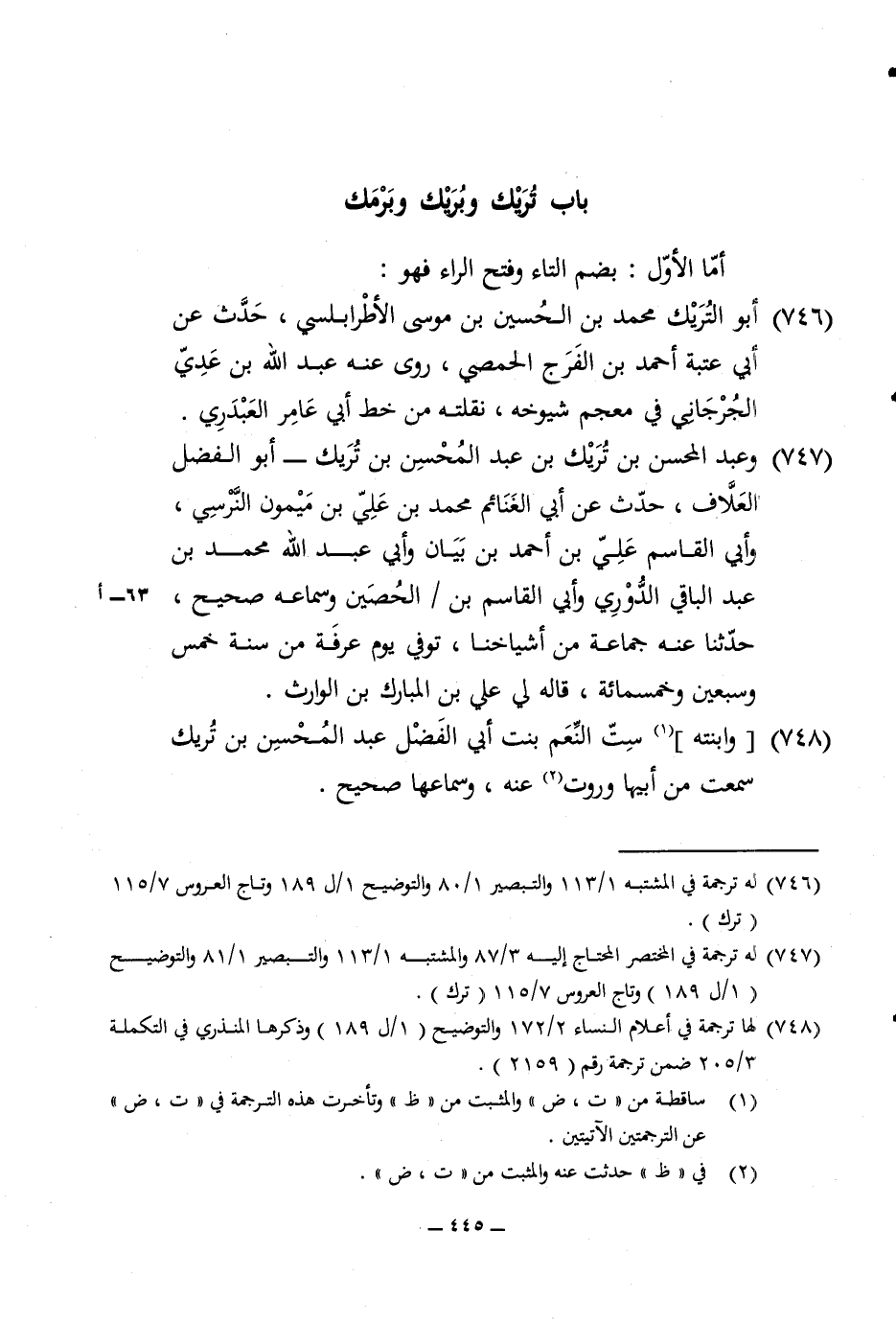 746 - أَبُو التريك مُحَمَّد بن الْحُسَيْن بن مُوسَى الأطرابلسي حدث عَن ابي عتبَة احْمَد بن الْفرج الْحِمصِي روى عَنهُ عبد الله بن عدي الْجِرْجَانِيّ فِي مُعْجم شُيُوخه نقلته من خطّ ابي عَامر الْعَبدَرِي
