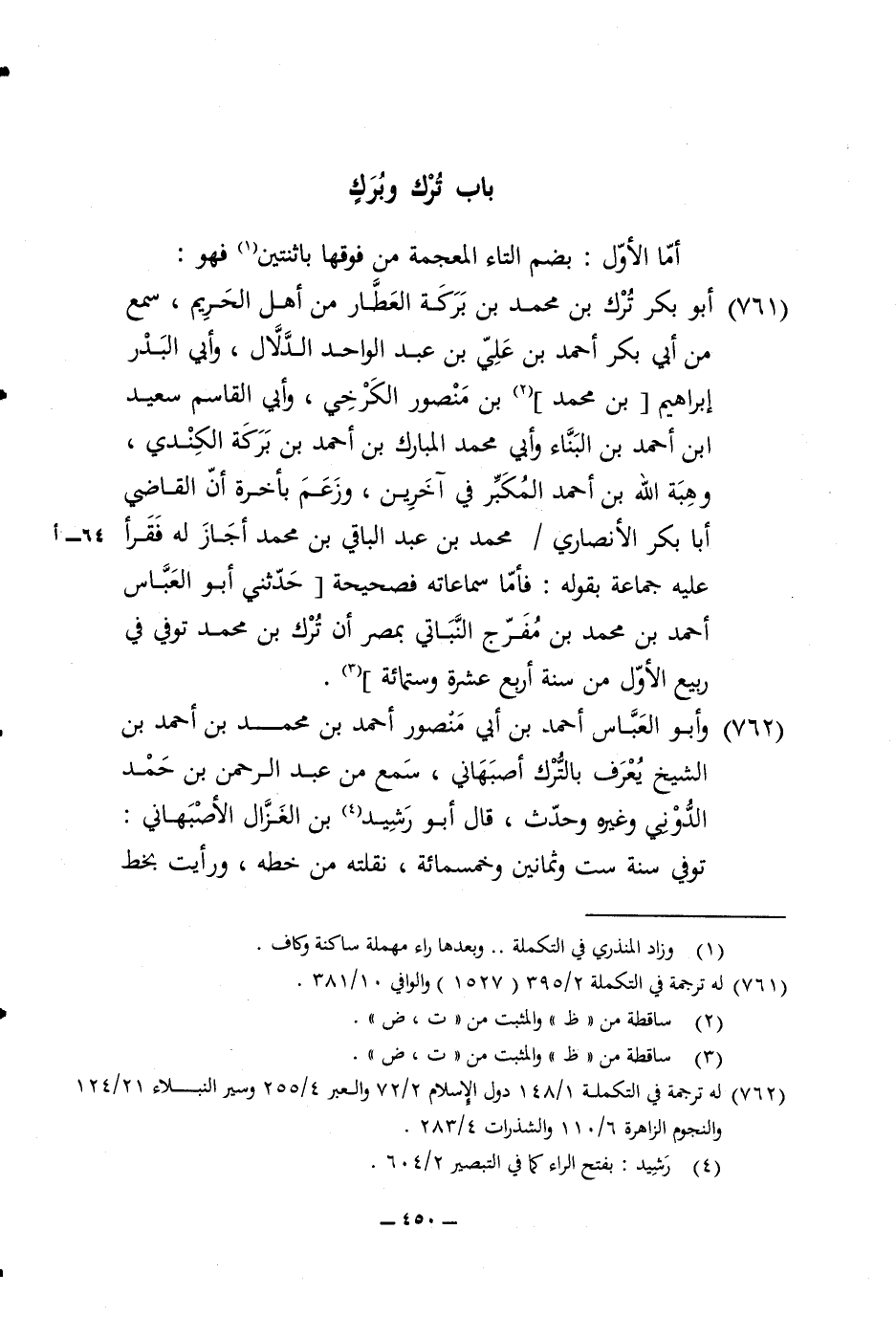 761 - أَبُو بكر ترك بن مُحَمَّد بن بركَة الْعَطَّار من أهل الْحَرِيم سمع من ابي بكر أَحْمد بن عَليّ بن عبد الْوَاحِد الدَّلال وَأبي الْبَدْر إِبْرَاهِيم بن مُحَمَّد بن مَنْصُور الْكَرْخِي وابي الْقَاسِم سعيد ابْن أَحْمد بن الْبناء وابي مُحَمَّد الْمُبَارك بن احْمَد بن بركَة الْكِنْدِيّ وَهبة الله بن أَحْمد المكبر فِي آخَرين وَزعم بِأخرَة ان القَاضِي أَبَا بكر الْأنْصَارِيّ مُحَمَّد بن عبد الْبَاقِي بن مُحَمَّد أجَاز لَهُ فقرا عَلَيْهِ فجماعة بقوله فَأَما سماعاته فصحيحة حَدثنِي أَبُو الْعَبَّاس أَحْمد بن مُحَمَّد بن مفرج النباتي بِمصْر أَن ترك بن مُحَمَّد توفّي فِي ربيع الأول من سنة أَربع عشرَة وسِتمِائَة
