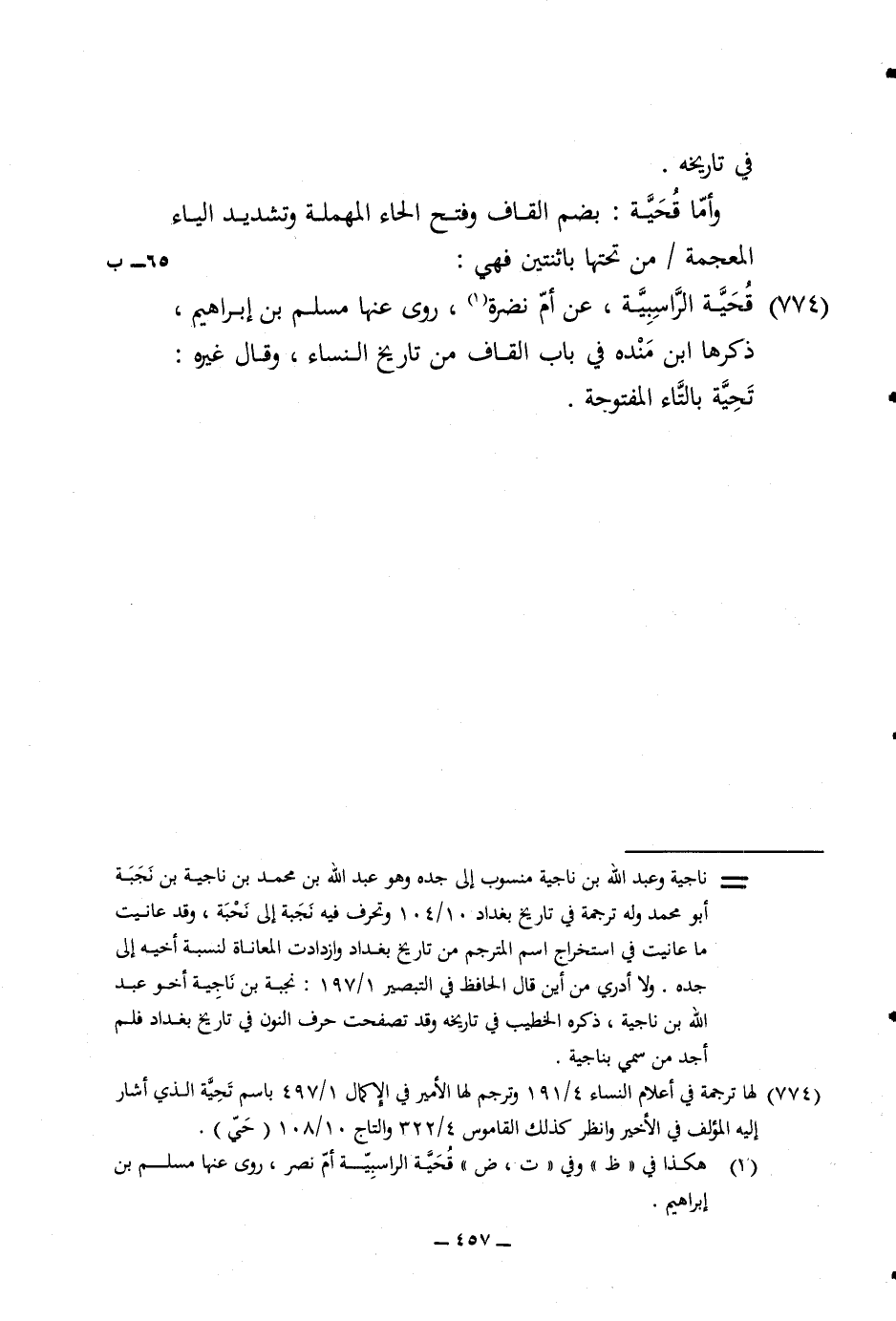 774 - قحية الراسبية عَن أم نَضرة روى عَنْهَا مُسلم بن إِبْرَاهِيم ذكرهَا ابْن مَنْدَه فِي بَاب الْقَاف من تَارِيخ النِّسَاء وَقَالَ غَيره تَحِيَّة بِالتَّاءِ الْمَفْتُوحَة
