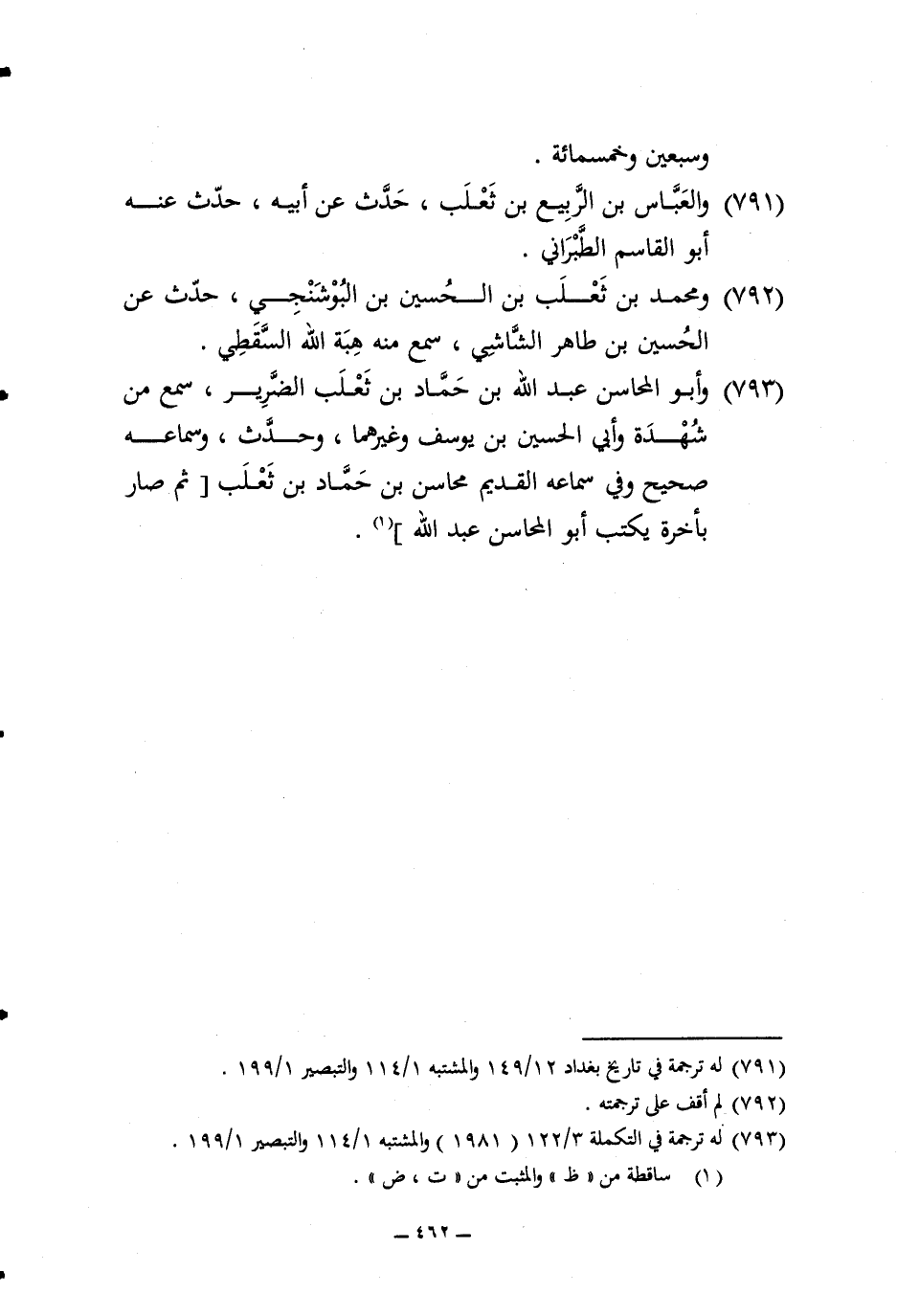 793 - وابو المحاسن عبد الله بن حَمَّاد بن ثَعْلَب الضَّرِير سمع من شهدة وَأبي الْحُسَيْن بن يُوسُف وَغَيرهمَا وَحدث وسماعه صَحِيح وَفِي سَمَاعه الْقَدِيم محَاسِن بن حَمَّاد بن ثَعْلَب ثمَّ صَار بِأخرَة يكْتب أَبُو المحاسن عبد الله