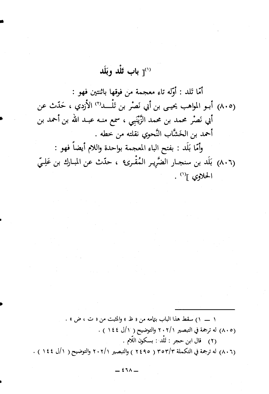 805 - أَبُو الْمَوَاهِب يحيى بن ابي نصر بن تَلد الْأَزْدِيّ حدث عَن أبي نصر مُحَمَّد بن مُحَمَّد الزَّيْنَبِي سمع مِنْهُ عبد الله بن احْمَد بن احْمَد بن الخشاب النَّحْوِيّ نقلته من خطه