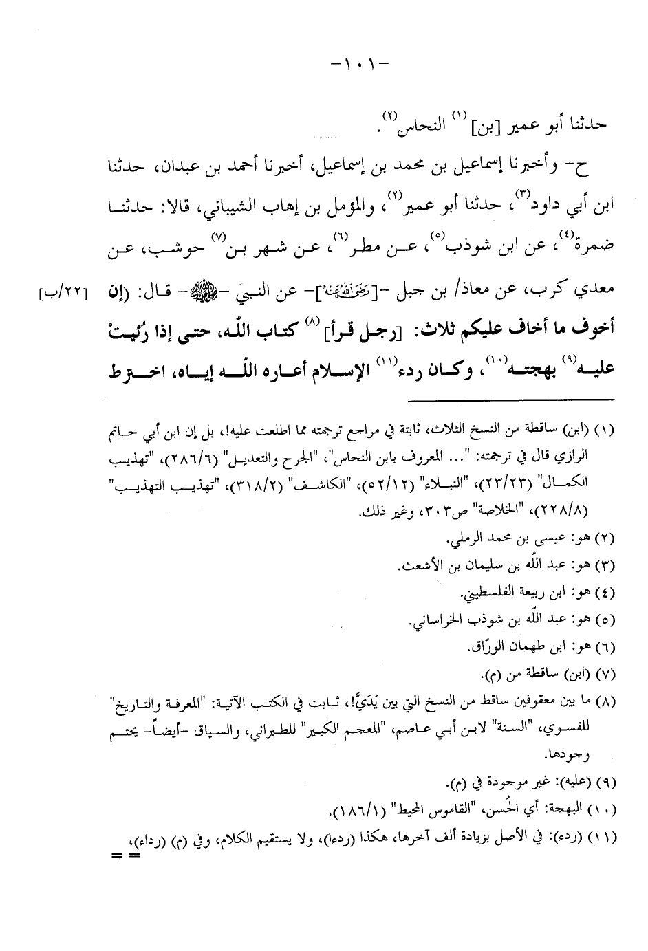 ح وَأَخْبَرَنَا إِسْمَاعِيلُ بْنُ مُحَمَّدِ بْنِ إِسْمَاعِيلَ أَخْبَرَنَا أَحْمَدُ بْنُ عَبْدَانَ حَدَّثَنَا ابْنُ أَبِي دَاوُدَ حَدَّثَنَا أَبُو عُمَيْرٍ وَالْمُؤَمَّلُ بْنُ إِهَابٍ الشَّيْبَانِيُّ قَالَا حَدَّثَنَا ضَمْرَةُ عَنِ ابْنِ شَوْذَبٍ عَنْ مَطَرٍ عَنْ شَهْرِ بْنِ حَوْشَبٍ عَنْ مَعْدِي كَرِبَ عَنْ مُعَاذِ بْنِ جَبَلٍ رَضِيَ اللَّهُ عَنْهُ عَنِ النَّبِيِّ صَلَّى اللَّهُ عَلَيْهِ وَسَلَّمَ قَالَ (إِنَّ أَخْوَفَ مَا أَخَافُ عَلَيْكُمْ ثَلَاثٌ رَجُلٌ قَرَأَ كِتَابَ اللَّهِ حَتَّى إِذَا رُئِيَتْ عَلَيْهِ بَهْجَتُهُ وَكَانَ رِدْءَ الْإِسْلَامِ أَعَارَهُ اللَّهُ إِيَّاهُ اخْتَرَطَ
