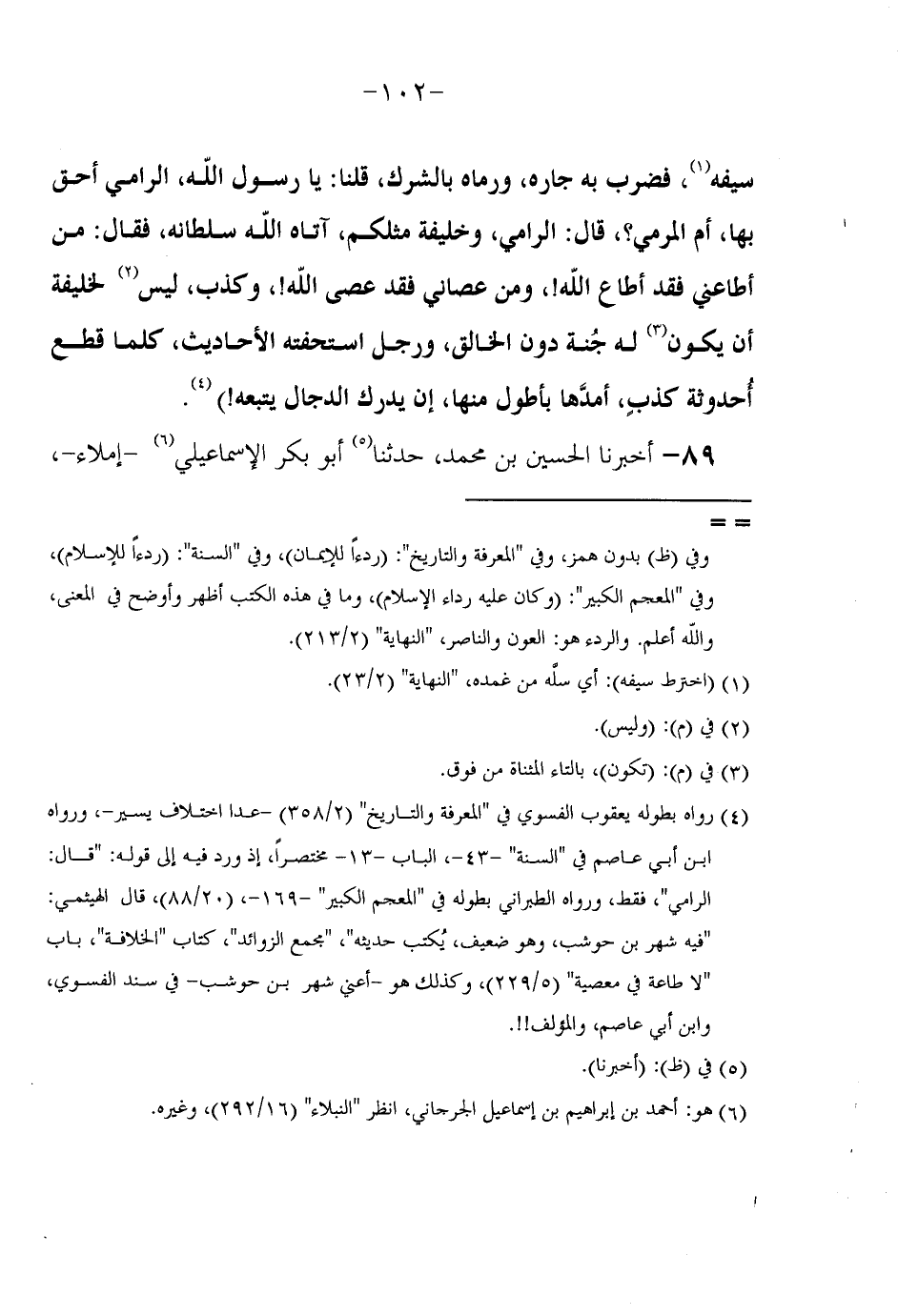 سَيْفَهُ فَضَرَبَ بِهِ جَارَهُ وَرَمَاهُ بِالشِّرْكِ قُلْنَا يَا رَسُولَ اللَّهِ الرَّامِي أَحَقُّ بِهَا أَمِ الْمَرْمِيُّ قَالَ الرَّامِي وَخَلِيفَةُ مِثْلِكُمْ آتَاهُ اللَّهُ سُلْطَانَهُ فَقَالَ مَنْ أَطَاعَنِي فَقَدْ أَطَاعَ اللَّهَ وَمَنْ عَصَانِي فَقَدْ عَصَى اللَّهَ وَكَذِبَ لَيْسَ لِخَلِيفَةٍ أَنْ يَكُونَ لَهُ جُنَّةُ دُونَ الْخَالِقِ وَرَجُلٌ اسْتَحَفَّتْهُ الْأَحَادِيثُ كُلَّمَا قَطَعَ أُحْدُوثَةَ كَذِبٍ أَمَدَّهَا بِأَطْوَلَ مِنْهَا إِنْ يُدْرِكِ الدَّجَّالَ يتبعهُ) رَوَاهُ بِطُولِهِ يَعْقُوب الْفَسَوِي فِي الْمعرفَة والتاريخ 2 / 358 عدا اخْتِلَاف يسير وَرَوَاهُ