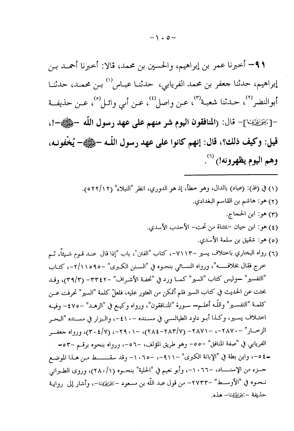 91 - أَخْبَرَنَا عُمَرُ بْنُ إِبْرَاهِيمَ وَالْحُسَيْنُ بْنُ مُحَمَّدٍ قَالَا أَخْبَرَنَا أَحْمَدُ بْنُ إِبْرَاهِيمَ حَدَّثَنَا جَعْفَرُ بْنُ مُحَمَّدٍ الْفِرْيَابِيُّ حَدَّثَنَا عَبَّاسُ بْنُ مُحَمَّدٍ حَدَّثَنَا أَبُو النَّضْرِ حَدَّثَنَا شُعْبَةُ عَنْ وَاصِلٍ عَنْ أَبِي وَائِلٍ عَنْ حُذَيْفَةَ رَضِيَ اللَّهُ عَنْهُ قَالَ الْمُنَافِقُونَ الْيَوْمَ شَرٌّ مِنْهُمْ عَلَى عَهْدِ رَسُولِ اللَّهِ صَلَّى اللَّهُ عَلَيْهِ وَسَلَّمَ قِيلَ وَكَيْفَ ذَلِكَ قَالَ إِنَّهُمْ كَانُوا على عهد رَسُول صَلَّى اللَّهُ عَلَيْهِ وَسَلَّمَ يُخْفُونَهُ وهم الْيَوْم يظهرونه رَوَاهُ البُخَارِيّ
