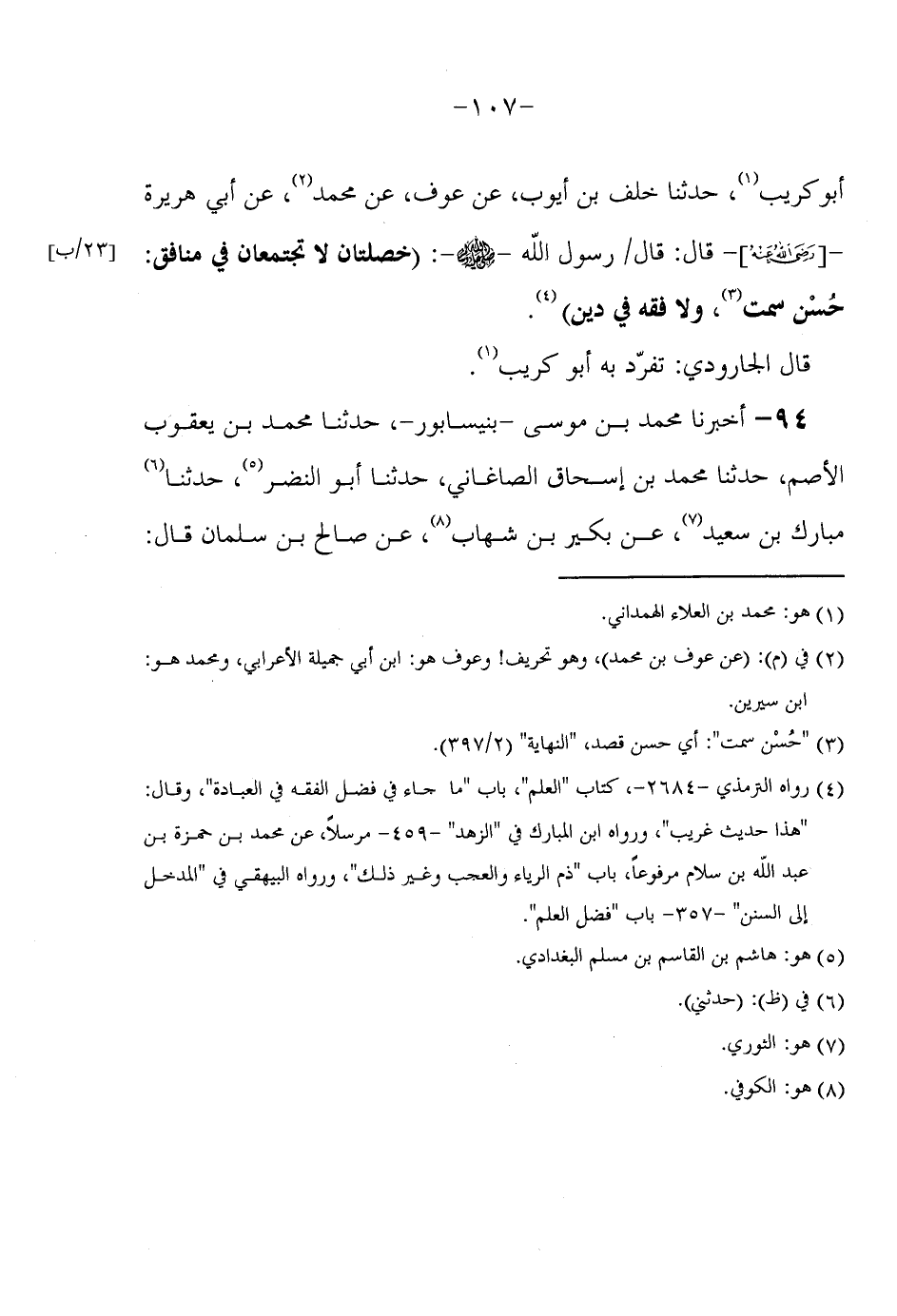 أَبُو كُرَيْبٍ حَدَّثَنَا خَلَفُ بْنُ أَيُّوبَ عَنْ عَوْفٍ عَنْ مُحَمَّدٍ عَنْ أَبِي هُرَيْرَةَ رَضِيَ اللَّهُ عَنْهُ قَالَ قَالَ رَسُولُ اللَّهِ صَلَّى اللَّهُ عَلَيْهِ وَسَلَّمَ (خِصْلَتَانِ لَا تَجْتَمِعَانِ فِي مُنَافِقٍ حُسْنُ سَمْتٍ وَلَا فَقْهَ فِي دِينٍ) رَوَاهُ التِّرْمِذِيّ