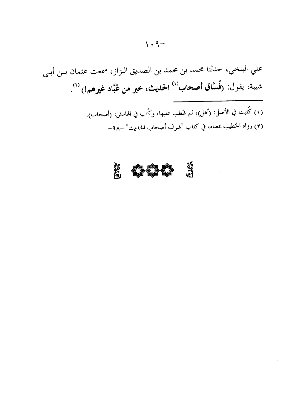 عَلِيٍّ الْبَلْخِيُّ حَدَّثَنَا مُحَمَّدُ بْنُ مُحَمَّدِ بْنِ الصِّدْيِقِ الْبَزَّازُ سَمِعْتُ عُثْمَانَ بْنَ أَبِي شَيْبَةَ يَقُولُ فُسَّاقٌ أَصْحَابُ الْحَدِيثِ خَيْرٌ مِنْ عباد غَيرهم) رَوَاهُ الْخَطِيب