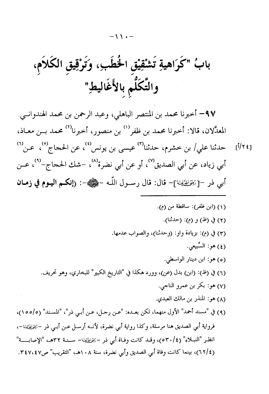 بَابُ كَرَاهِيَةِ تَشْقِيقِ الْخُطَبِ وَتَرْقِيقِ الْكَلَامِ وَالتَّكَلُّمِ بِالْأَغَالِيطِ