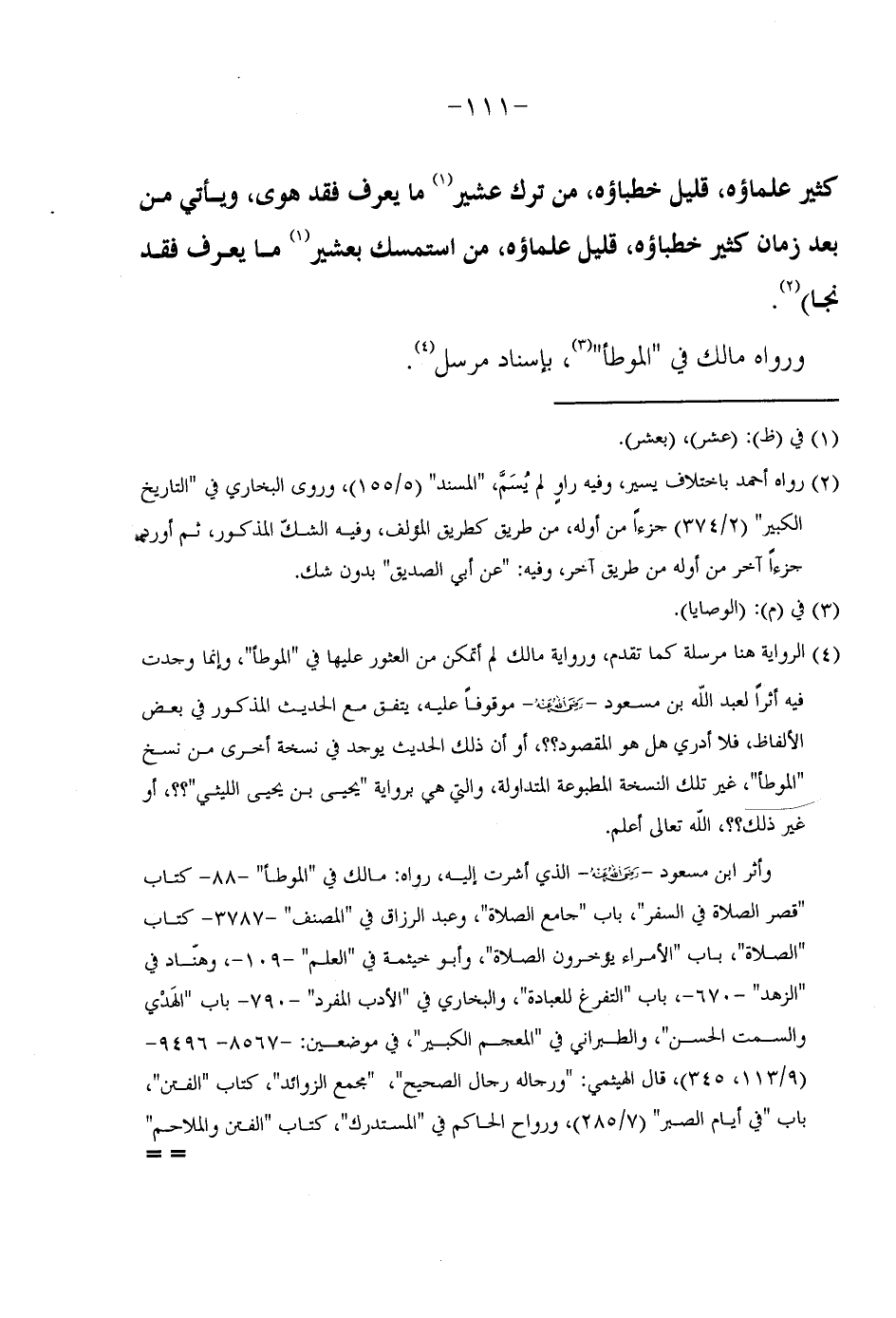 كَثِيرٍ عُلَمَاؤُهُ قَلِيلٍ خُطَبَاؤُهُ مَنْ تَرَكَ عَشِيرَ مَا يَعْرِفُ فَقَدْ هَوَى وَيَأْتِي مِنْ بَعْدُ زَمَانٌ كَثِيرٌ خُطَبَاؤُهُ قَلِيلٌ عُلَمَاؤُهُ مَنِ اسْتَمْسَكَ بِعَشِيرِ مَا يَعْرِفُ فَقَدْ نجا) رَوَاهُ أَحْمد