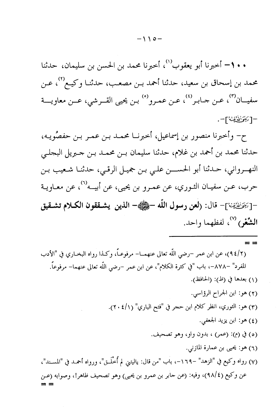 ح وَأَخْبَرَنَا مَنْصُورُ بْنُ إِسْمَاعِيلَ أَخْبَرَنَا مُحَمَّدُ بْنُ عُمَرَ بْنِ حَفْصُوَيْهِ حَدَّثَنَا مُحَمَّدُ بْنُ أَحْمَدَ بْنِ غُلَامٍ حَدَّثَنَا سُلَيْمَانُ بْنُ مُحَمَّدِ بْنِ جِبْرِيلَ الْبَجَلِيُّ النَّهْرَوَانِيُّ حَدَّثَنَا أَبُو الْحَسَنِ عَلِيُّ بْنُ جَمِيلٍ الرَّقِيُّ حَدَّثَنَا شُعَيْبُ بْنُ حَرْبٍ عَنْ سُفْيَانَ الثَّوْرِيِّ عَنْ عَمْرِو بْنِ يَحْيَى عَنْ أَبِيهِ عَنْ مُعَاوِيَةَ رَضِيَ اللَّهُ عَنْهُ قَالَ (لَعَنَ رَسُولُ اللَّهِ صَلَّى اللَّهُ عَلَيْهِ وَسَلَّمَ الَّذِينَ يُشَقِّقُونَ الْكَلَام تشقيق الشّعْر) رَوَاهُ وَكِيع فِي الزّهْد 169 بَاب من قَالَ يَا لَيْتَني لم أخلق وَرَوَاهُ أَحْمد فِي الْمسند لَفْظُهُمَا وَاحِدٌ