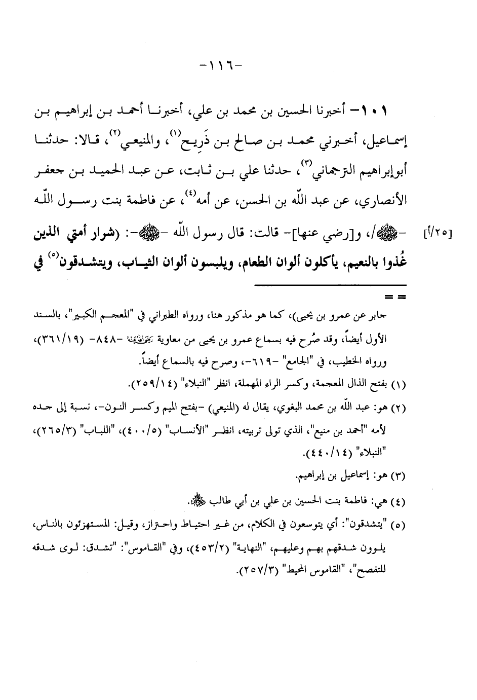 101 - أَخْبَرَنَا الْحُسَيْنُ بْنُ مُحَمَّدِ بْنِ عَلِيٍّ أَخْبَرَنَا أَحْمَدُ بْنُ إِبْرَاهِيمَ بْنِ إِسْمَاعِيلَ أَخْبَرَنِي مُحَمَّدُ بْنُ صَالِحِ بْنَ ذَرِيحٍ وَالْمَنِيعِيُّ قَالَا حَدَّثَنَا أَبُو إِبْرَاهِيمَ التُّرْجُمَانِيُّ حَدَّثَنَا عَلِيُّ بْنُ ثَابِتٍ عَنْ عَبْدِ الْحَمِيدِ بْنِ جَعْفَرٍ الْأَنْصَارِيِّ عَنْ عَبْدِ اللَّهِ بْنِ الْحَسَنِ عَنْ أُمِّهِ عَنْ فَاطِمَةَ بِنْتِ رَسُولِ اللَّهِ صَلَّى اللَّهُ عَلَيْهِ وَسَلَّمَ وَرَضِيَ عَنْهَا قَالَتْ قَالَ رَسُولُ اللَّهِ صَلَّى اللَّهُ عَلَيْهِ وَسَلَّمَ (شِرَارُ أُمَّتِي الَّذِينَ غُذُّوا بِالنَّعِيمِ يَأْكُلُون ألوان الطَّعَامَ وَيَلْبَسُونَ أَلْوَانَ الثِّيَابِ وَيَتَشَدَّقُونَ فِي
