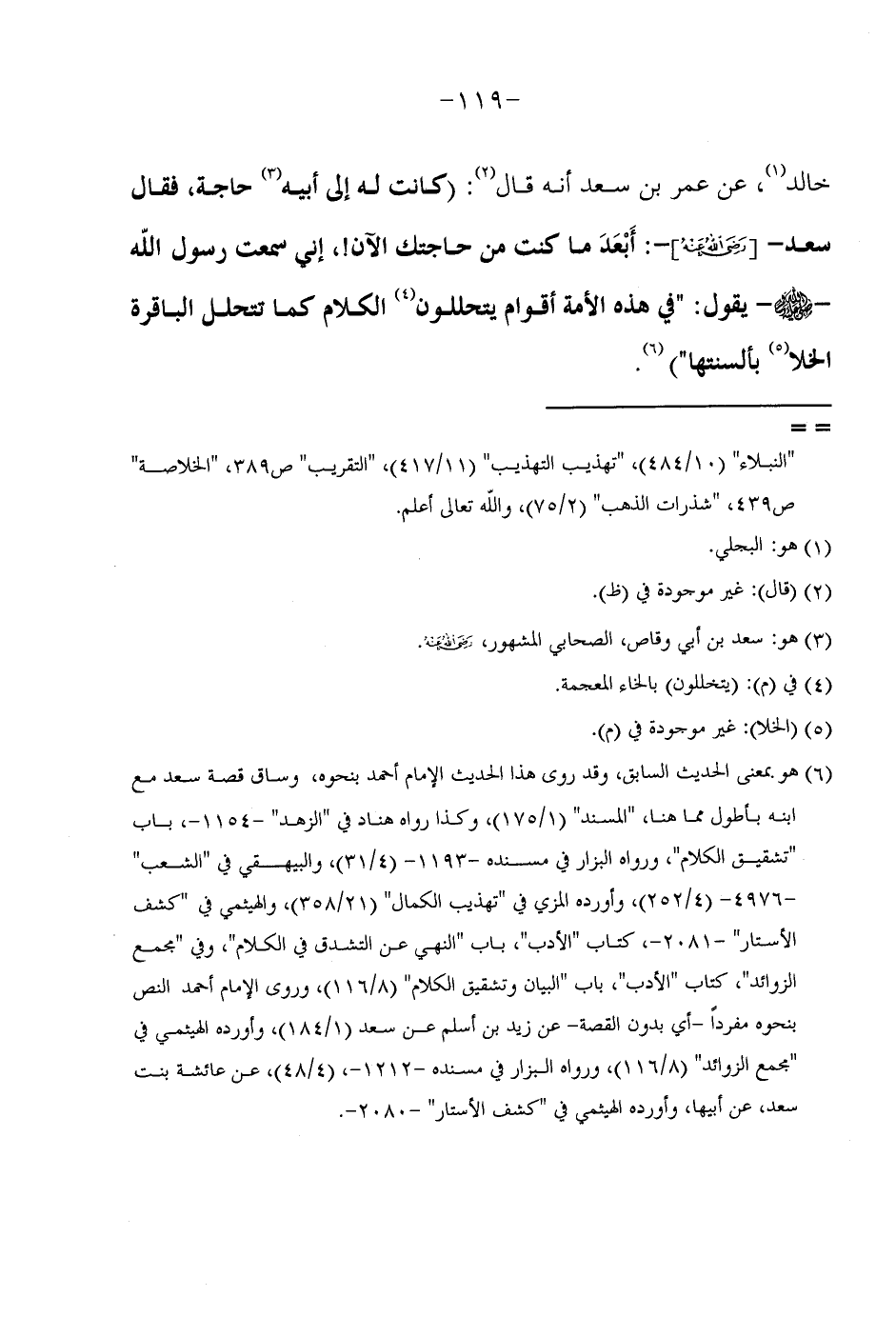 خَالِدٍ عَنْ عُمَرَ بْنِ سَعْدٍ أَنَّهُ قَالَ كَانَتْ لَهُ إِلَى أَبِيهِ حَاجَةٌ فَقَالَ سَعْدٌ رَضِيَ اللَّهُ عَنْهُ أَبْعَدَ مَا كُنْتُ مِنْ حَاجَتِكَ الْآنَ إِنِّي سَمِعْتُ رَسُولُ اللَّهِ صَلَّى اللَّهُ عَلَيْهِ وَسَلَّمَ يَقُولُ (فِي هَذِهِ الْأُمَّةِ أَقوام يتحللون الْكَلَام كَمَا تتحلل الباقرة الخلا بألسنتها) روى هَذَا الحَدِيث الإِمَام أَحْمد بِنَحْوِهِ