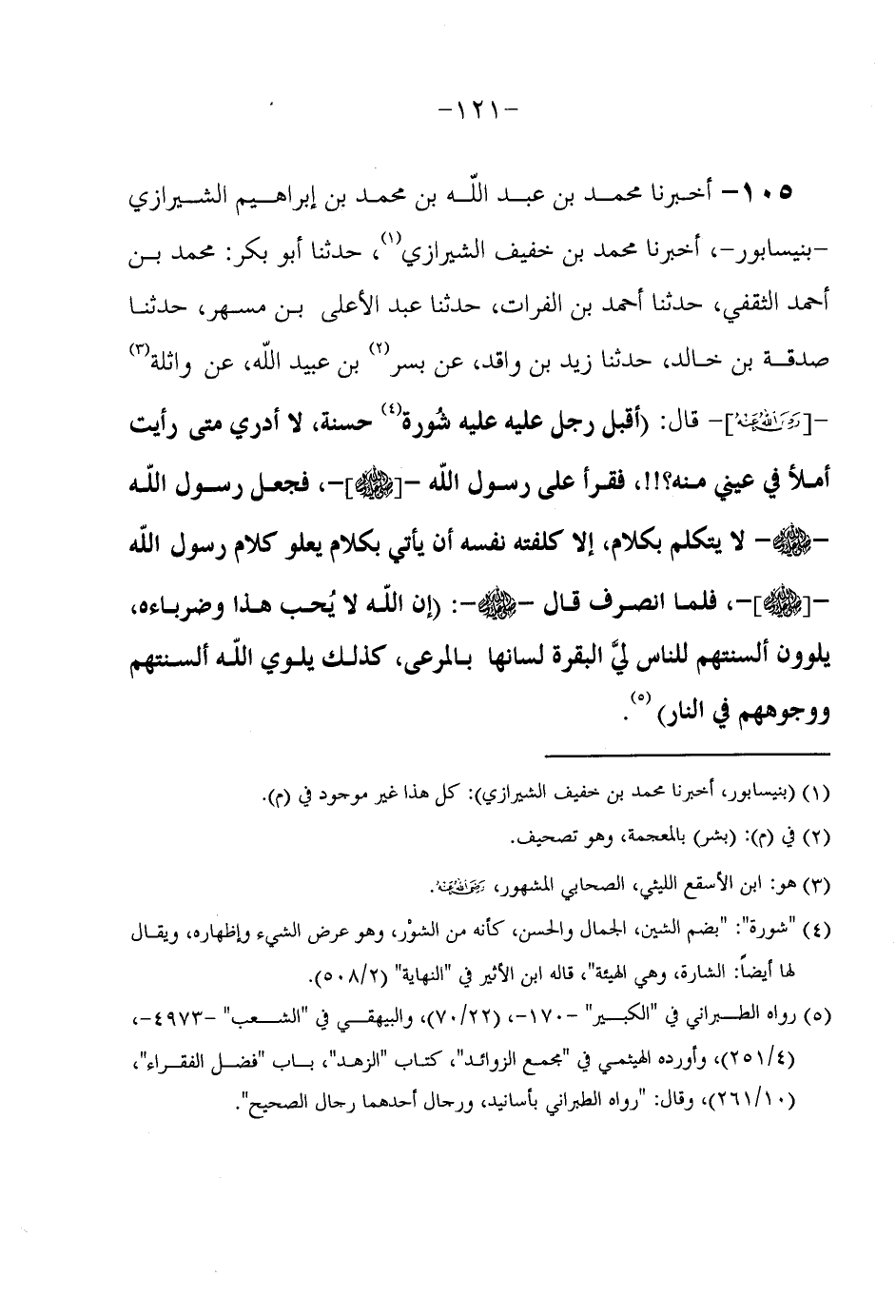 105 - أَخْبَرَنَا مُحَمَّدُ بْنُ عَبْدُ اللَّهِ بْنُ مُحَمَّدِ بْنِ إِبْرَاهِيمَ الشِّيرَازِيُّ بِنَيْسَابُورَ أَخْبَرَنَا مُحَمَّدُ بْنُ خَفِيفٍ الشِّيرَازِيُّ حَدَّثَنَا أَبُو بَكْرِ مُحَمَّدُ بْنُ أَحْمَدَ الثَّقَفِيُّ حَدَّثَنَا أَحْمَدُ بْنُ الْفَرَّاتِ حَدَّثَنَا عَبْدُ الْأَعْلَى بْنُ مُسْهِرٍ حَدَّثَنَا صَدَقَةُ بْنُ خَالِدٍ حَدَّثَنَا زَيْدُ بْنُ وَاقِدٍ عَنْ بِسْرِ بْنِ عُبَيْدِ اللَّهِ عَنْ وَاثِلَةَ رَضِيَ اللَّهُ عَنْهُ قَالَ أَقْبَلَ رَجُلٌ عَلَيْهِ عَلِيّهِ شُورَةٌ حَسَنَةُ لَا أَدْرِي مَتَى رَأَيْتُ أَمْلَأَ فِي عَيْنِي مِنْهُ فَقَرَأَ عَلَى رَسُولِ اللَّهِ صَلَّى اللَّهُ عَلَيْهِ وَسَلَّمَ فَجَعَلَ رَسُولُ اللَّهِ صَلَّى اللَّهُ عَلَيْهِ وَسَلَّمَ لَا يَتَكَلَّمُ بِكَلَامٍ إِلَّا كَلَفَتْهُ نَفْسُهُ أَنْ يَأْتِيَّ بِكَلَامٍ يَعْلُو كَلَامَ رَسُولِ اللَّهِ صَلَّى اللَّهُ عَلَيْهِ وَسَلَّمَ فَلَمَّا انْصَرَفَ قَالَ صَلَّى اللَّهُ عَلَيْهِ وَسَلَّمَ (إِنَّ اللَّهَ لَا يُحِبُّ هَذَا وَضُرَبَاءَهُ يَلْوُونَ أَلْسِنَتَهُمْ لِلنَّاسِ لَّيَّ الْبَقَرَةِ لِسَانَهَا بِالْمَرْعَى كَذَلِكَ يَلْوِي اللَّهُ أَلْسِنَتَهُمْ وَوُجُوهَهُمْ فِي النَّارِ) رَوَاهُ الطَّبَرَانِيّ