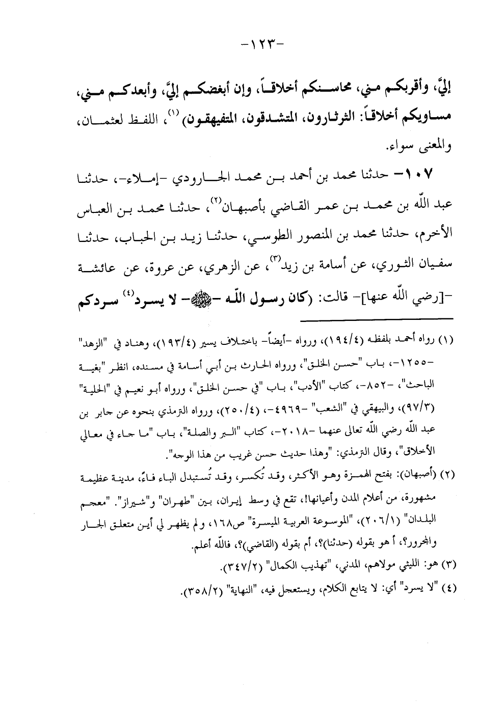 107 - حَدَّثَنَا مُحَمَّدُ بْنُ أَحْمَدَ بْنِ مُحَمَّدِ الْجَارُودِيُّ إِمْلَاءً حَدَّثَنَا عَبْدُ اللَّهِ بْنُ مُحَمَّدِ بْنِ عُمَرَ الْقَاضِي بِأَصْبَهَانَ حَدَّثَنَا مُحَمَّدُ بْنُ الْعَبَّاسِ الْأَخْرَمُ حَدَّثَنَا مُحَمَّدُ بْنُ الْمَنْصُورِ الطُّوسِيُّ حَدَّثَنَا زَيْدُ بْنُ الْحَبَّابِ حَدَّثَنَا سُفْيَانُ الثَّوْرِيُّ عَنْ أُسَامَةَ بْنِ زَيْدٍ عَنِ الزُّهْرِيِّ عَنْ عُرْوَةَ عَنْ عَائِشَةَ رَضِيَ اللَّهُ عَنْهَا قَالَتْ (كَانَ رَسُولُ اللَّهِ صَلَّى اللَّهُ عَلَيْهِ وَسَلَّمَ لَا يَسْرِدُ سَرْدَكُمْ