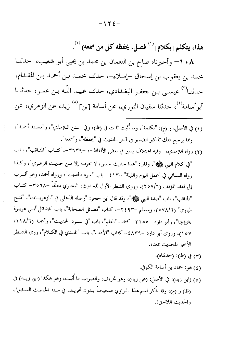 108 - وَأَخْبَرَنَاهُ صَالِحُ بْنُ النُّعْمَانِ بْنِ مُحَمَّدِ بْنِ يَحْيَى أَبُو شُعَيْبٍ حَدَّثَنَا مُحَمَّدُ بْنُ يَعْقُوبَ بْنِ إِسْحَاقَ إِمْلَاءً حَدَّثَنَا مُحَمَّدُ بْنُ أَحْمَدَ بْنِ الْمِقْدَامِ حَدَّثَنَا عِيسَى بْنُ جَعْفَرٍ الْبَغْدَادِيُّ حَدَّثَنَا عُبَيْدُ اللَّهِ بْنُ عُمَرَ حَدَّثَنَا أَبُو أُسَامَةَ حَدَّثَنَا سُفْيَانُ الثَّوْرِيُّ عَنْ أُسَامَةَ بْنِ زَيْدٍ عَنِ الزُّهْرِيِّ عَنْ
