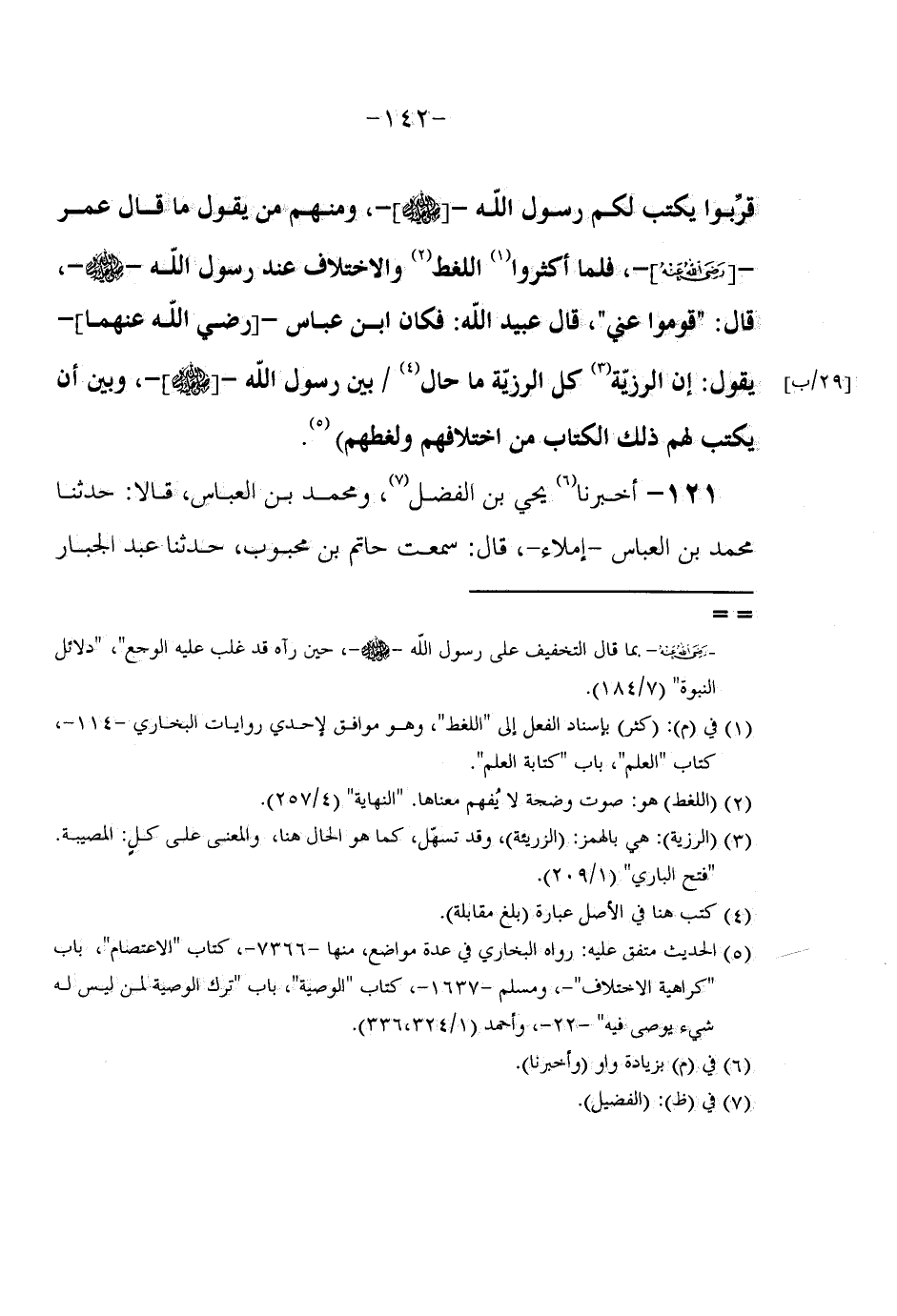قَرِّبُوا يَكْتُبُ لَكُمْ رَسُولُ اللَّهِ صَلَّى اللَّهُ عَلَيْهِ وَسَلَّمَ وَمِنْهُمْ مَنْ يَقُولُ مَا قَالَ عُمَرُ رَضِيَ اللَّهُ عَنْهُ فَلَمَّا أَكْثَرُوا اللَّغَطَ وَالِاخْتِلَافَ عِنْدَ رَسُولِ اللَّهِ صَلَّى اللَّهُ عَلَيْهِ وَسَلَّمَ قَالَ قُومُوا عِنِّي قَالَ عُبَيْدُ اللَّهِ فَكَانَ ابْنُ عَبَّاسٍ رَضِيَ اللَّهُ عَنْهُمَا يَقُولُ إِنَّ الرَّزِيَّةَ كُلُّ الرَّزِيَّةِ مَا حَالَ بَيْنَ رَسُولِ اللَّهِ صَلَّى اللَّهُ عَلَيْهِ وَسَلَّمَ وَبَيْنَ أَنْ يَكْتُبَ لَهُمْ ذَلِكَ الْكتاب من اخْتلَافهمْ ولغطهم) الحَدِيث مُتَّفق عَلَيْهِ