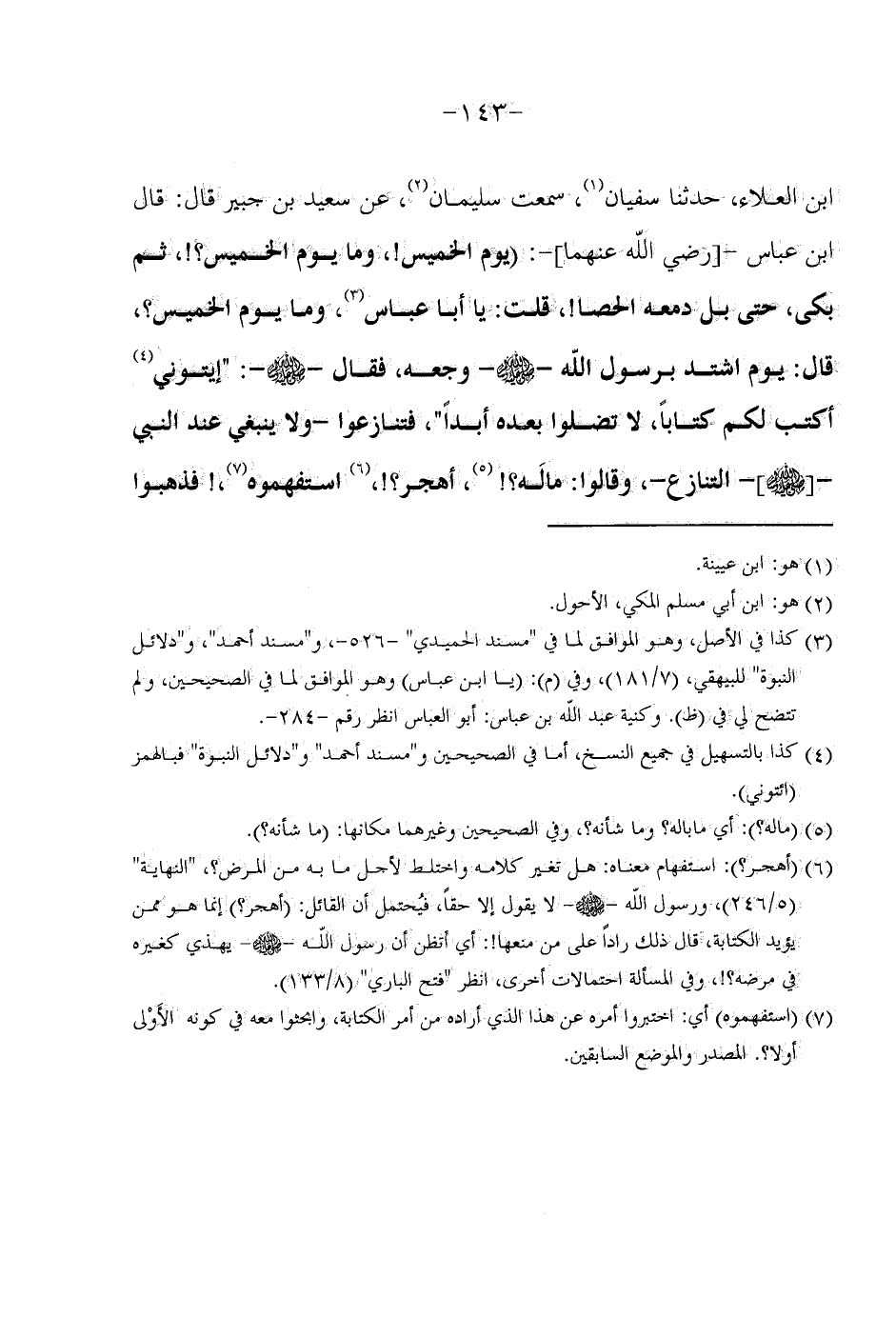 ابْن الْعَلَاءِ حَدَّثَنَا سُفْيَانُ سَمِعْتُ سُلَيْمَانَ عَنْ سَعِيدِ بْنِ جُبَيْرٍ قَالَ قَالَ ابْنُ عَبَّاسٍ رَضِيَ اللَّهُ عَنْهُمَا (يَوْمَ الْخَمِيسِ وَمَا يَوْمُ الْخَمِيسِ ثُمَّ بَكَى حتَّى بَلَّ دَمْعُهُ الْحَصَا قُلْتُ يَا أَبَا عَبَّاسٍ وَمَا يَوْمُ الْخَمِيسِ قَالَ يَوْمُ اشْتَدَّ بِرَسُولِ اللَّهِ صَلَّى اللَّهُ عَلَيْهِ وَسَلَّمَ وَجَعُهُ فَقَالَ صَلَّى اللَّهُ عَلَيْهِ وَسَلَّمَ إِيتُونِي أَكْتُبُ لَكُمْ كِتَابًا لَا تَضِلُّوا بَعْدَهُ أَبَدًا فَتَنَازَعُوا وَلَا يَنْبَغِي عِنْدَ النَّبِيِّ صَلَّى اللَّهُ عَلَيْهِ وَسلم التَّنَازُع وَقَالُوا مَاله أَهَجَرَ اسْتَفْهِمُوهُ فَذَهَبُوا
