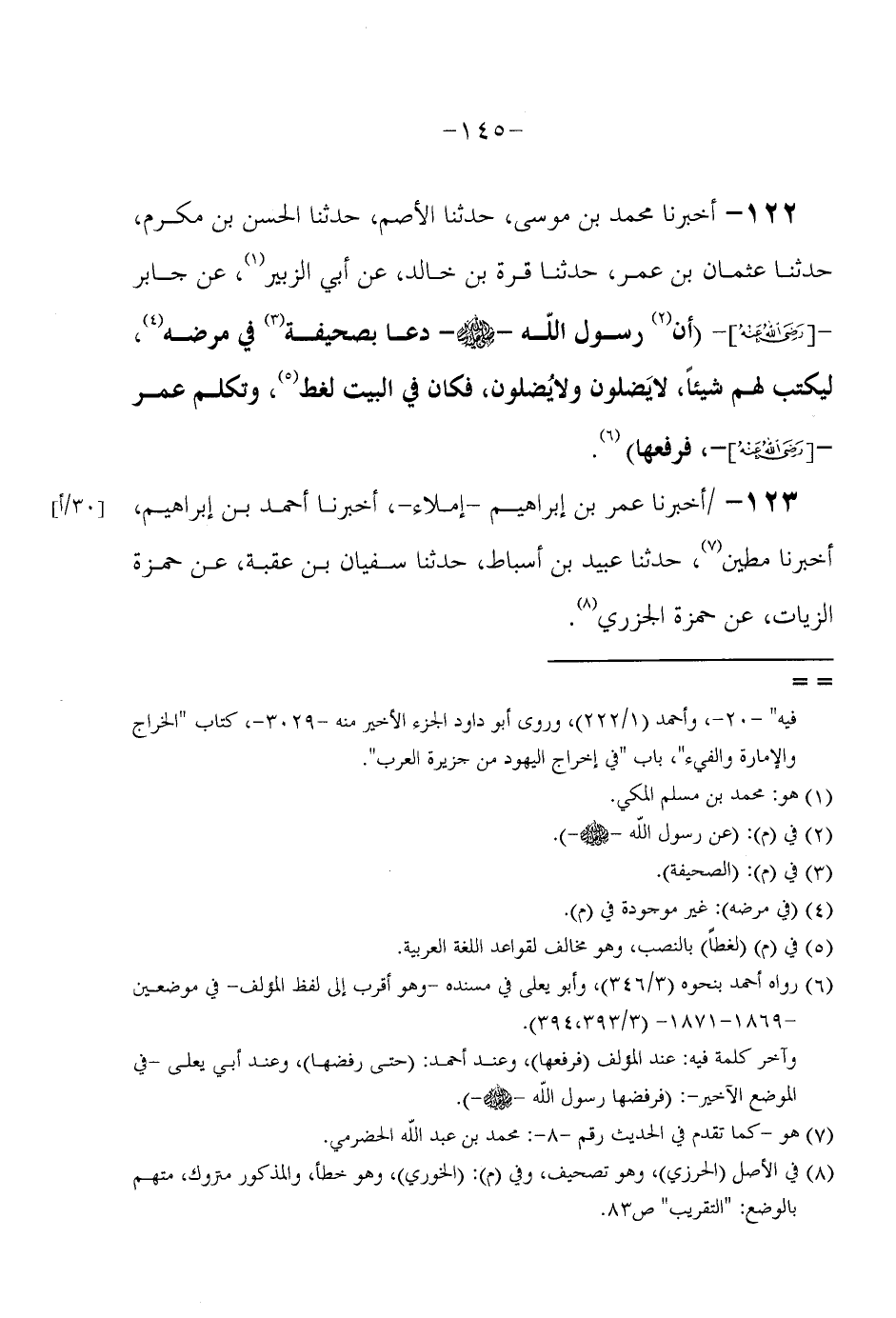 122 - أَخْبَرَنَا مُحَمَّدُ بْنُ مُوسَى حَدَّثَنَا الْأَصَمُّ حَدَّثَنَا الْحَسَنُ بْنُ مُكْرِمٍ حدَّثَنَا عُثْمَانُ بْنُ عُمَرَ حَدَّثَنَا قُرَّةُ بْنُ خَالِدٍ عَنِ أَبِي الزُّبَيْرِ عَنْ جَابِرٍ رَضِيَ اللَّهُ عَنْهُ (أَنَّ رَسُولَ اللَّهِ صَلَّى اللَّهُ عَلَيْهِ وَسَلَّمَ دَعَا بِصَحِيفَةٍ فِي مَرَضِهِ لِيَكْتُبَ لَهُمْ شَيْئًا لَا يَضَلُّونَ وَلَا يُضِلُّونَ فَكَانَ فِي الْبَيْتِ لَغَطٌ وَتَكَلَّمَ عُمَرُ رَضِي الله عَنهُ فَرَفعهَا) رَوَاهُ أَحْمد