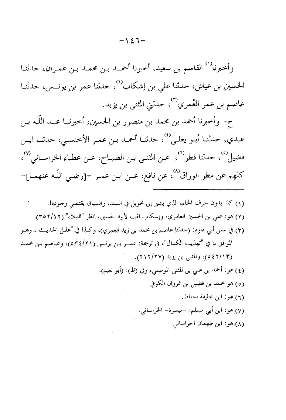 ح وَأَخْبَرَنَا أَحْمَدُ بْنُ مُحَمَّدِ بْنِ مَنْصُورِ بْنِ الْحُسَيْنِ أَخْبَرَنَا عَبْدُ اللَّهِ بْنُ عَدِيٍّ حَدَّثَنَا أَبُو يَعْلَى حَدَّثَنَا أَحْمَدُ بْنُ عُمَرَ الْأَخْنَسِيُّ حَدَّثَنَا ابْنُ فُضَيْلٍ حَدَّثَنَا فُطْرٌ عَنِ الْمُثَنَّى بْنُ الصَّبَّاحِ عَنْ عَطَاءٍ الْخُرَاسَانِيُّ كُلِّهِمْ عَنْ مَطَرٍ الْوَرَّاقِ عَنْ نَافِعٍ عَنِ ابْنِ عُمَرَ رَضِيَ اللَّهُ عَنْهُمَا