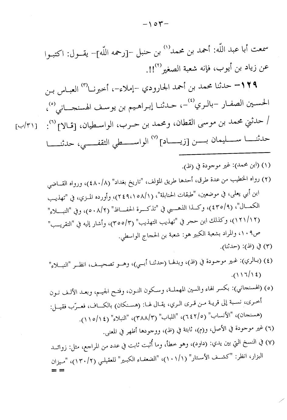 129 - حَدَّثَنَا مُحَمَّدُ بْنُ أَحْمَدَ الْجَارُودِيُّ إِمْلَاءً أَخْبَرَنَا الْعَبَّاسُ بْنُ الْحُسَيْنِ الصَّفَّارُ بِالرَّيِّ حَدَّثَنَا إِبْرَاهِيمُ بْنُ يُوسُفَ الْهَسَنْجَانِيُّ حَدَّثَنِي مُحَمَّدُ بْنُ مُوسَى الْقَطَّانُ وَمُحَمَّدُ بْنُ حَرْبٍ الْوَاسِطِيَّانِ قَالَا حَدَّثَنَا سُلَيْمَانُ بْنُ زِيَادٍ الْوَاسِطِيُّ الثَّقَفِيُّ حَدَّثَنَا