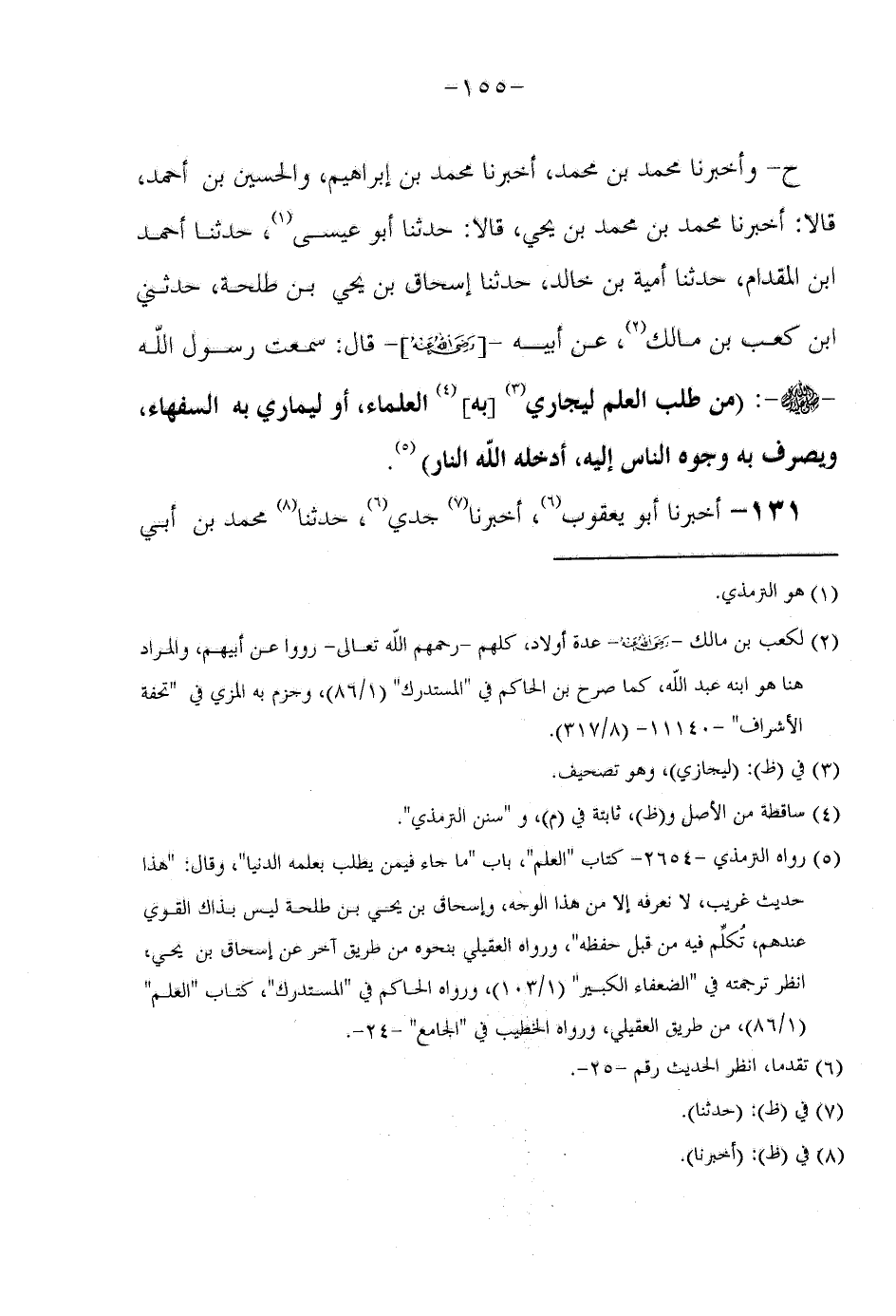 ح وَأَخْبَرَنَا مُحَمَّدُ بْنُ مُحَمَّدِ أَخْبَرَنَا مُحَمَّدُ بْنُ إِبْرَاهِيمَ وَالْحُسَيْنُ بْنُ أَحْمَدَ قَالَا أَخْبَرَنَا مُحَمَّدُ بْنُ مُحَمَّدِ بْنِ يَحْيَى قَالَا حَدَّثَنَا أَبُو عِيسَى حَدَّثَنَا أَحْمَدُ بْنُ الْمِقْدَامِ حَدَّثَنَا أُمَيَةُ بْنُ خَالِد حَدثنَا إِسْحَاق بن يحي بْنِ طَلْحَةَ حَدَّثَنِي ابْنُ كَعْبِ بْنِ مَالِكٍ عَنْ أَبِيهِ رَضِيَ اللَّهُ عَنْهُ قَالَ سَمِعْتُ رَسُولَ اللَّهِ صَلَّى اللَّهُ عَلَيْهِ وَسَلَّمَ (مَنْ طَلَبَ الْعِلْمَ لِيُجَارِيَّ بِهِ الْعُلَمَاءَ أَوْ لِيُمَارِيَّ بِهِ السُّفَهَاءَ وَيَصْرِفَ بِهِ وُجُوهَ النَّاسِ إِلَيْهِ ادخله الله النَّار) رَوَاهُ التِّرْمِذِيّ