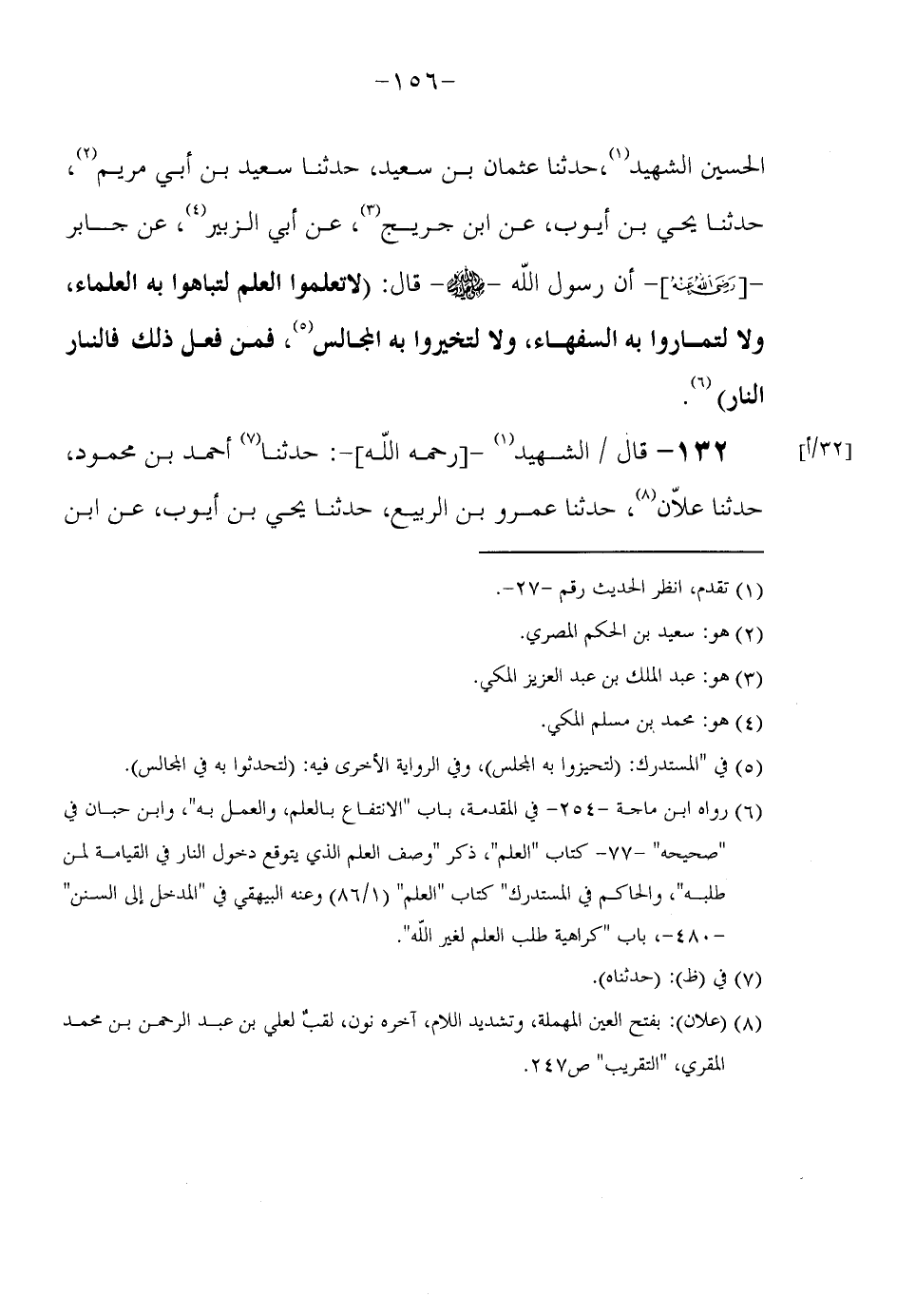 الْحُسَيْنِ الشَّهِيدُ حَدَّثَنَا عُثْمَانُ بْنُ سَعِيدٍ حَدَّثَنَا سَعِيدُ بْنُ أَبِي مَرْيَم حَدثنَا يحي بْنُ أَيُّوبَ عَنِ ابْنِ جُرَيْجٍ عَنِ أَبِي الزُّبَيْرِ عَنْ جَابِرٍ رَضِيَ اللَّهُ عَنْهُ أَنَّ رَسُولَ اللَّهِ صَلَّى اللَّهُ عَلَيْهِ وَسَلَّمَ قَالَ (لَا تَعَلَّمُوا الْعِلْمَ لِتُبَاهُوا بِهِ الْعُلَمَاءَ وَلَا لِتُمَارُوا بِهِ السُّفَهَاءَ وَلَا لِتُخَيِّرُوا بِهِ الْمَجَالِسَ فَمَنْ فَعَلَ ذَلِكَ فَالنَّارُ النَّارُ) رَوَاهُ ابْن ماجة
