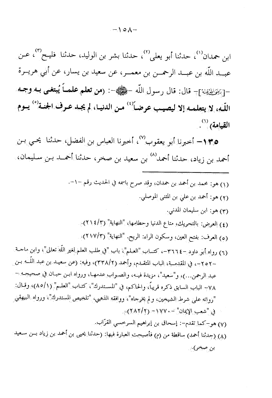 ابْنُ حِمْدَانَ حَدَّثَنَا أَبُو يَعْلَى حَدَّثَنَا بِشْرُ بْنُ الْوَلِيدِ حَدَّثَنَا فُلَيْحٌ عَنْ عَبْدِ اللَّهِ بْنِ عَبْدِ الرَّحْمَنِ بْنِ مَعْمَرٍ عَنْ سَعِيدِ بْنِ يَسَارٍ عَنْ أَبِي هُرَيْرَةَ رَضِيَ اللَّهُ عَنْهُ قَالَ قَالَ رَسُولُ اللَّهِ صَلَّى اللَّهُ عَلَيْهِ وَسَلَّمَ (مَنْ تَعَلَّمَ عِلْمًا يُبْتَغَى بِهِ وَجْهُ اللَّهِ لَا يَتَعَلَّمُهُ إِلَّا لِيُصِيبَ عَرَضًا مِنَ الدُّنْيَا لَمْ يَجِدْ عَرَفَ الْجَنَّةِ يَوْم الْقِيَامَة) رَوَاهُ أَبُو دَاوُد