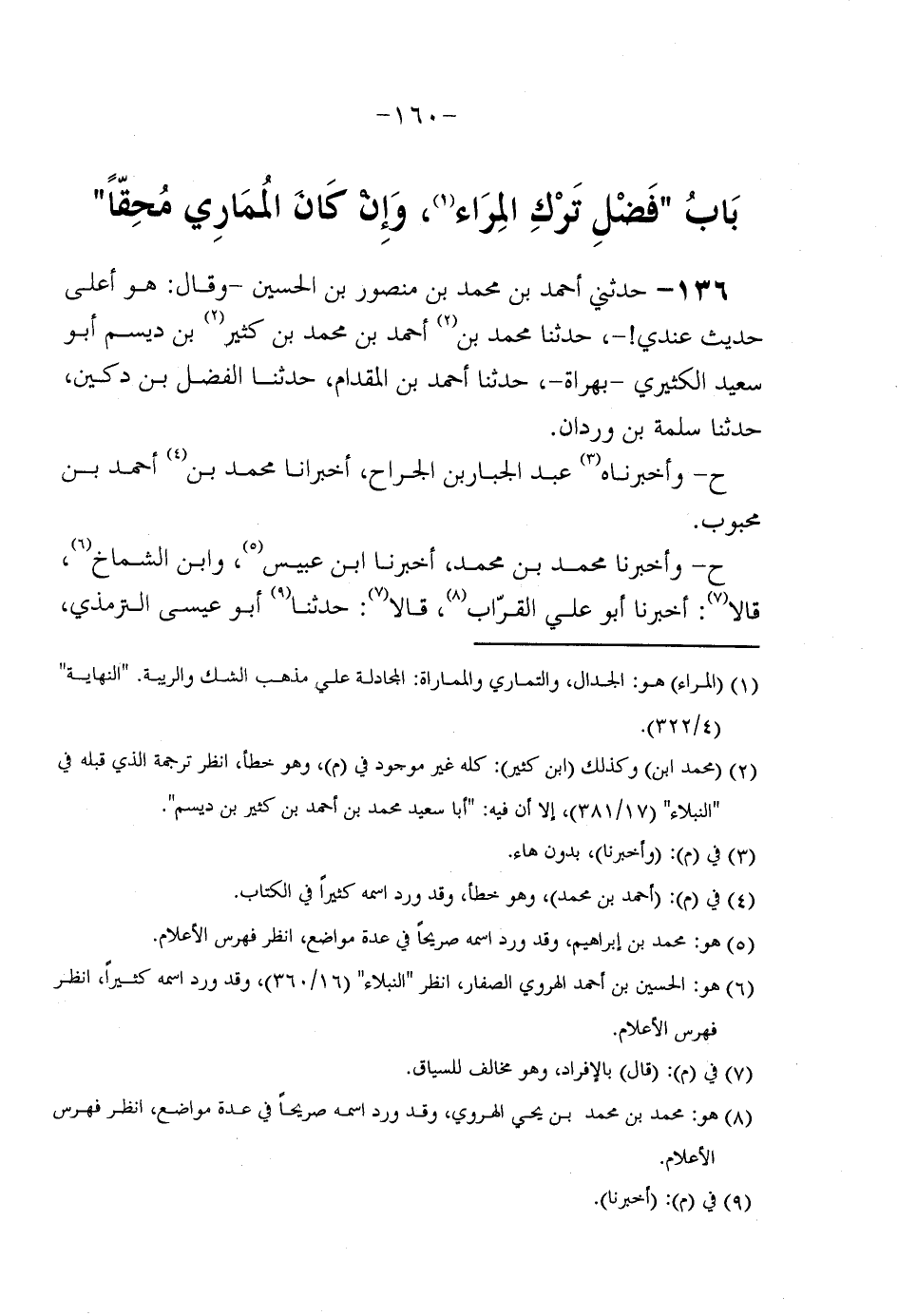 136 - حَدَّثَنِي أَحْمَدُ بْنُ مُحَمَّدِ بْنِ مَنْصُورِ بْنِ الْحُسَيْنِ وَقَالَ هُوَ أَعْلَى حَدِيثٍ عِنْدِي حَدَّثَنَا مُحَمَّدُ بْنُ أَحْمَدَ بْنِ مُحَمَّدِ بْنِ كَثِيرِ بْنِ دَيْسَمٍ أَبُو سَعِيدٍ الْكَثِيرِيُّ بِهَرَاةَ حَدَّثَنَا أَحْمَدُ بْنُ الْمِقْدَامِ حَدَّثَنَا الْفَضْلُ بْنُ دُكَيْنٍ حَدَّثَنَا سَلَمَةُ بْنُ وَرْدَانَ