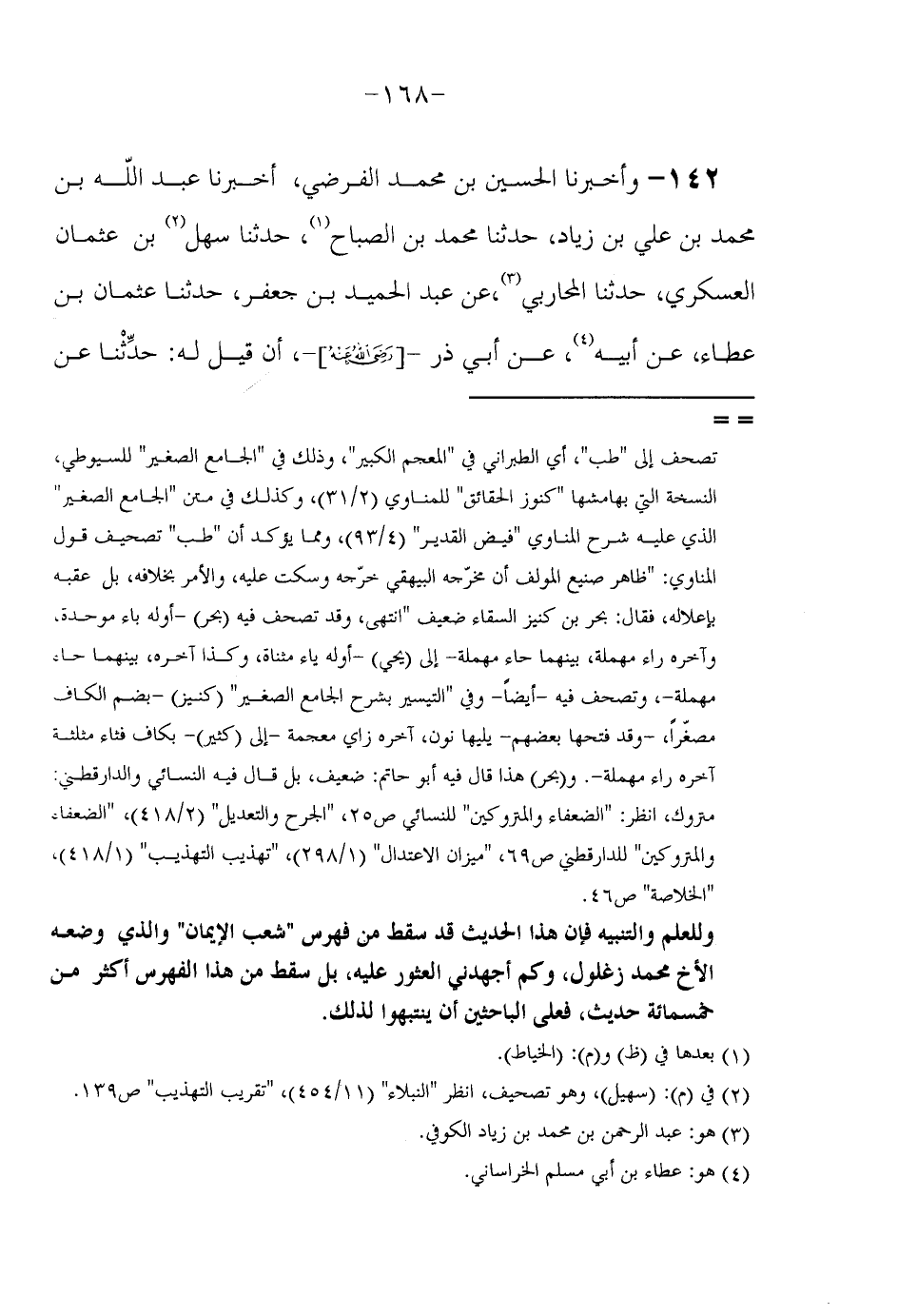 142 - وَأَخْبَرَنَا الْحُسَيْنُ بْنُ مُحَمَّدٍ الْفَرْضِيُّ أَخْبَرَنَا عَبْدُ اللَّهِ بْنُ مُحَمَّدِ بْنِ عَلِيِّ بْنِ زِيَادٍ حَدَّثَنَا مُحَمَّدُ بْنُ الصَّبَّاحِ حَدَّثَنَا سَهْلُ بْنُ عُثْمَانَ الْعَسْكَرِيُّ حَدَّثَنَا الْمُحَارِبِيُّ عَنْ عَبْدِ الْحَمِيدِ بْنِ جَعْفَرٍ حَدَّثَنَا عُثَمْانُ بْنُ عَطَاءٍ عَنْ أَبِيهِ عَنْ أَبِي ذَرٍّ رَضِيَ اللَّهُ عَنْهُ أَنْ قِيلَ لَهُ حَدِّثْنَا عَنْ