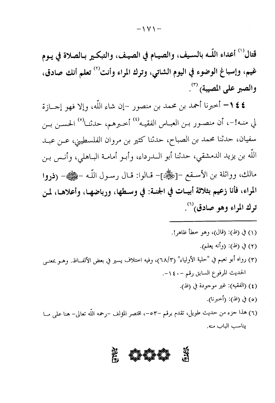 144 - أَخْبَرَنَا أَحْمَدُ بْنُ مُحَمَّدِ بْنِ مَنْصُورٍ إِنْ شَاءَ اللَّهُ وَإِلَّا فَهُوَ إِجَازَةً لِي مِنْهُ أَنَّ مَنْصُورَ بْنَ الْعَبَّاسِ الْفَقِيهَ أَخْبَرَهُمْ حَدَّثَنَا الْحَسَنُ بْنُ سُفْيَانَ حَدَّثَنَا مُحَمَّدُ بْنُ الصَّبَّاحِ حَدَّثَنَا كَثِيرُ بْنُ مَرْوَانَ الْفِلَسْطِينِيُّ عَنْ عَبْدِ اللَّهِ بْنِ يَزِيدَ الدِّمَشْقِيِّ حَدَّثَنَا أَبُو الدَّرْدَاءِ وَأَبُو أُمَامَةَ الْبَاهِلِيُّ وَأَنَسُ بْنُ مَالِكٍ وَوَاثِلَةُ بْنُ الْأَسْقَعِ رَضِيَ اللَّهُ عَنْهُمْ قَالُوا قَالَ رَسُولُ اللَّهِ صَلَّى اللَّهُ عَلَيْهِ وَسَلَّمَ (ذَرُّوا الْمِرَاءَ فَأَنَا زَعِيمٌ بِثَلَاثَةِ أَبْيَاتٍ فِي الْجَنَّةِ فِي وَسَطِهَا وَرِبَاضِهَا وَأَعْلَاهَا لَمِنْ تَرَكَ الْمِرَاءَ وَهُوَ صَادِقٌ) هَذَا جُزْء من حَدِيث طَوِيل تقدم برقم 53
