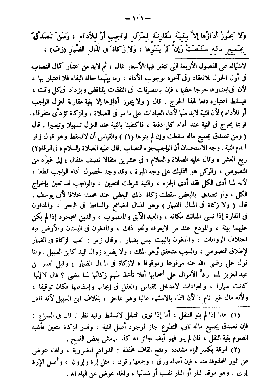 وَلَا يَجُوزُ أَدَاؤُهَا إِلَّا بِنِيَّةٍ مُقَارِنَةٍ لِعَزْلِ الْوَاجِبِ أَوْ لِلْأَدَاءِ؟ وَمَنْ تَصَدَّقَ بِجَمِيعِ مَالِهِ سَقَطَتْ وَإِنْ لَمْ يَنْوِهَا وَلَا زَكَاةَ فِي الْمَالِ الضِّمَارِ (ز ف) ،