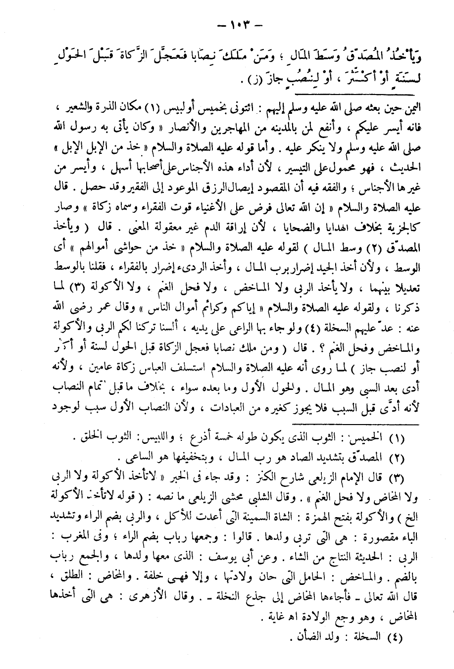 قَالَ: " وَيَأْخُذُ الْمُصَدِّقُ وَسَطَ الْمَالِ " لِقَوْلِهِ - عَلَيْهِ الصَّلَاةُ وَالسَّلَامُ -: «خُذْ مِنْ حَوَاشِي أَمْوَالَهِمْ» أَيِ الْوَسَطِ، وَلِأَنَّ أَخْذَ الْجَيِّدِ إِضْرَارٌ بِرَبِّ الْمَالِ، وَأَخْذَ الرَّدِيءِ إِضْرَارٌ بِالْفُقَرَاءِ، فَقُلْنَا بِالْوَسَطِ تَعْدِيلًا بَيْنَهُمَا، وَلَا يَأْخُذُ الرَّبِيَّ وَلَا الْمَاخِضَ، وَلَا فَحْلَ الْغَنَمِ، وَلَا الْأَكُولَةَ لِمَا ذَكَرْنَا، وَلِقَوْلِهِ - عَلَيْهِ الصَّلَاةُ وَالسَّلَامُ -: «إِيَّاكُمْ وَكَرَائِمَ أَمْوَالِ النَّاسِ» وَقَالَ عُمَرُ - رَضِيَ اللَّهُ عَنْهُ -: عُدَّ عَلَيْهُمُ السَّخْلَةَ وَلَوْ جَاءَ بِهَا الرَّاعِي عَلَى يَدَيْهِ، أَلَسْنَا تَرَكْنَا لكم الرَّبِيَّ وَالْأَكُولَةَ وَالْمَاخِضَ وَفَحْلَ الْغَنَمِ؟ .