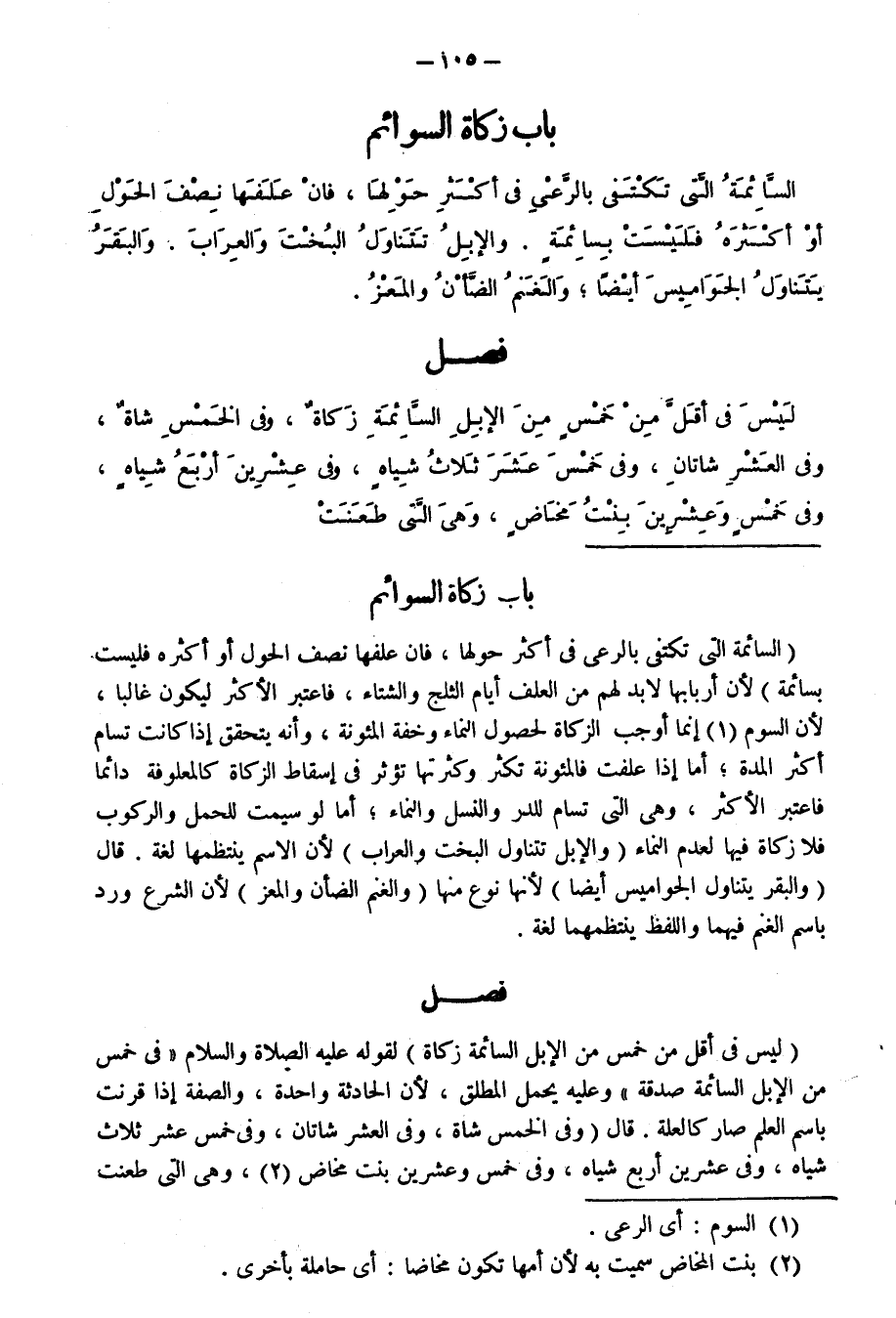 بَابُ زَكَاةِ السَّوَائِمِ السَّائِمَةُ الَّتِي تَكْتَفِي بِالرَّعْيِ فِي أَكْثَرَ حَوْلِهَا، فَإِنْ عَلَفَهَا نِصْفَ الْحَوْلِ أَوْ أَكْثَرَهُ فَلَيْسَتْ بِسَائِمَةٍ. وَالْإِبِلُ تَتَنَاوَلُ الْبُخْتَ وَالْعِرَابَ. وَالْبَقَرُ يَتَنَاوَلُ الْجَوَامِيسَ أَيْضًا ; وَالْغَنَمُ الضَّأْنُ وَالْمَعْزُ.