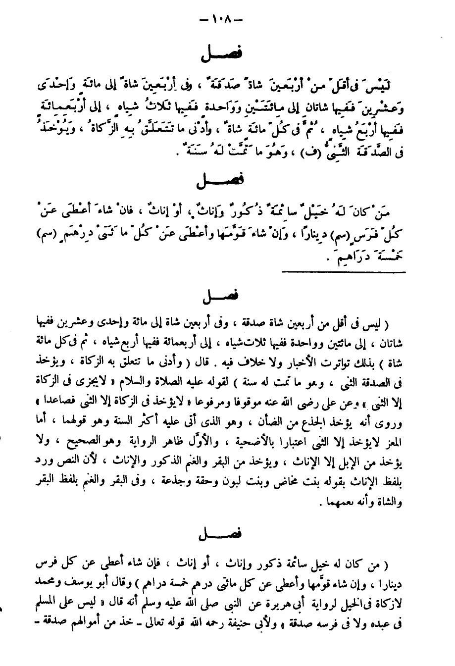 فَصْلٌ لَيْسَ فِي أَقَلَّ مِنْ أَرْبَعِينَ شَاةً صَدَقَةٌ، وَفِي أَرْبَعِينَ شَاةٌ إِلَى مِائَةٍ وَإِحْدَى وَعِشْرِينَ فَفِيهَا شَاتَانِ إِلَى مِائَتَيْنِ وَوَاحِدَةٍ فَفِيهَا ثَلَاثُ شِيَاهٍ، إِلَى أَرْبَعِمَائَةٍ فَفِيهَا أَرْبَعُ شِيَاهٍ، ثُمَّ فِي كُلِّ مِائَةٍ شَاةٌ، وَأَدْنَى مَا تَتَعَلَّقُ بِهِ الزَّكَاةُ، وَيُؤْخَذُ فِي الصَّدَقَةِ الثَّنِيُّ (ف) ، وَهُوَ مَا تَمَّتْ لَهُ سَنَةٌ.