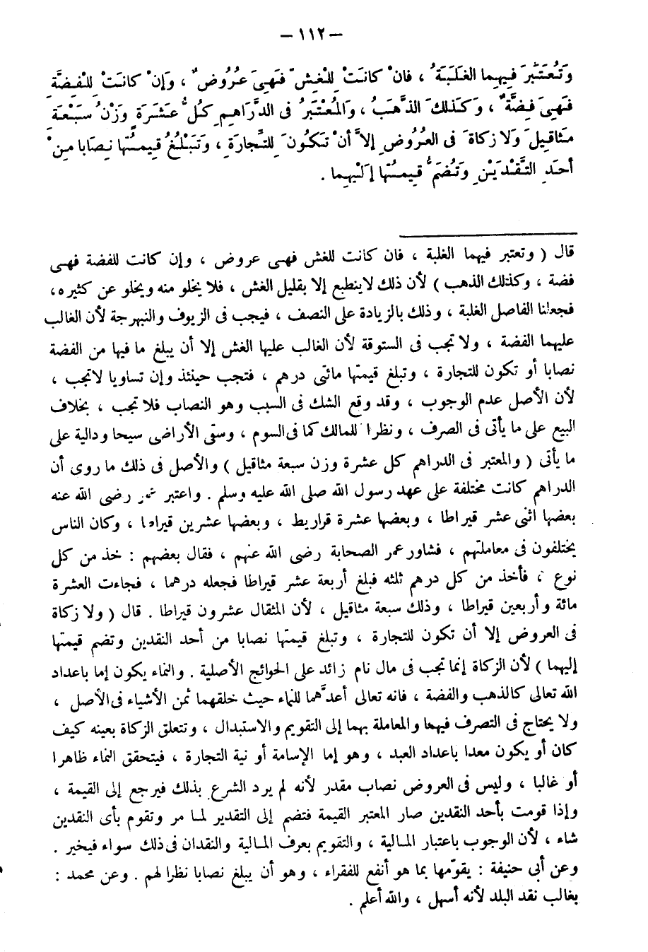 قَالَ: (وَلَا زَكَاةَ فِي الْعُرُوضِ إِلَّا أَنْ تَكُونَ لِلتِّجَارَةِ، وَتَبْلُغُ قِيمَتُهَا نِصَابًا مِنْ أَحَدِ النَّقْدَيْنِ وَتُضَمُّ قِيمَتُهَا إِلَيْهِمَا) لِأَنَّ الزَّكَاةَ إِنَّمَا تَجِبُ فِي مَالٍ نَامٍ زَائِدٍ عَلَى الْحَوَائِجِ الْأَصْلِيَّةِ. وَالنَّمَاءُ يَكُونُ إِمَّا بِإِعْدَادِ اللَّهِ تَعَالَى كَالذَّهَبِ وَالْفِضَّةِ، فَإِنَّهُ تَعَالَى أَعَدَّهُمَا لِلنَّمَاءِ حَيْثُ خَلَقَهُمَا ثَمَنَ الْأَشْيَاءِ فِي الْأَصْلِ، وَلَا يَحْتَاجُ فِي التَّصَرُّفِ فِيهِمَا وَالْمُعَامَلَةِ بِهِمَا إِلَى التَّقْوِيمِ وَالِاسْتِبْدَالِ، وَتَتَعَلَّقُ الزَّكَاةُ بِعَيْنِهِ كَيْفَ كَانَ أَوْ يَكُونُ مُعَدًّا بِإِعْدَادِ الْعَبْدِ، وَهُوَ إِمَّا الْإِسَامَةُ أَوْ نِيَّةُ التِّجَارَةِ، فَيَتَحَقَّقُ النَّمَاءُ ظَاهِرًا أَوْ غَالِبًا، وَلَيْسَ فِي الْعُرُوضِ نِصَابٌ مُقَدَّرٌ لِأَنَّهُ لَمْ يَرِدِ الشَّرْعُ بِذَلِكَ فَيُرْجَعُ إِلَى الْقِيمَةِ، وَإِذَا قُوِّمَتْ بِأَحَدِ النَّقْدَيْنِ صَارَ الْمُعْتَبَرُ الْقِيمَةَ فَتُضَمُّ إِلَى التَّقْدِيرِ لِمَا مَرَّ وَتُقَوَّمُ بِأَيِّ النَّقْدَيْنِ شَاءَ؛ لِأَنَّ الْوُجُوبَ بِاعْتِبَارِ الْمَالِيَّةِ، وَالتَّقْوِيمُ يُعَرِّفُ الْمَالِيَّةَ، وَالنَّقْدَانِ فِي ذَلِكَ سَوَاءٌ فَيُخَيَّرُ. وَعَنْ أَبِي حَنِيفَةَ: يَقَوِّمُهَا بِمَا هُوَ أَنْفَعُ لِلْفُقَرَاءِ، وَهُوَ أَنْ يَبْلُغَ نِصَابًا نَظَرًا لَهُمْ. وَعَنْ مُحَمَّدٍ: بِغَالِبِ نَقْدِ الْبَلَدِ لِأَنَّهُ أَسْهَلُ، وَاللَّهُ أَعْلَمُ.