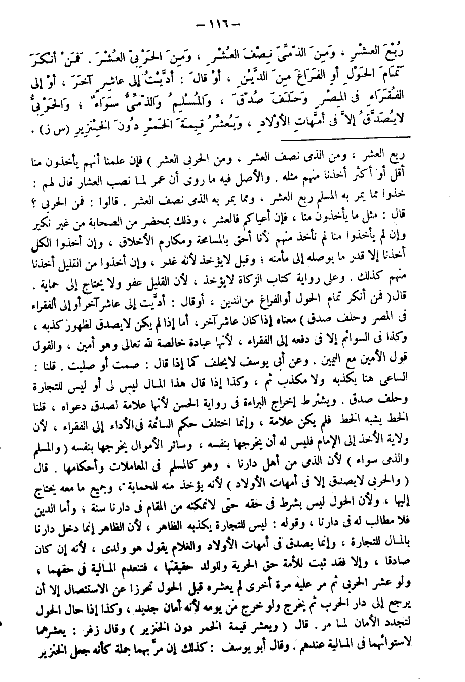 رُبُعَ الْعُشْرِ. وَمِنَ الذِّمِّيِّ نِصْفَ الْعُشْرِ، وَمِنَ الْحَرْبِيِّ الْعُشْرَ. فَمَنْ أَنْكَرَ تَمَامَ الْحَوْلِ أَوِ الْفَرَاغَ مِنَ الدَّيْنِ، أَوْ قَالَ: أَدَّيْتُ إِلَى عَاشِرٍ آخَرَ أَوْ إِلَى الْفُقَرَاءِ فِي الْمِصْرِ وَحَلَفَ صُدِّقَ. وَالْمُسْلِمُ وَالذِّمِّيُّ سَوَاءٌ، وَالْحَرْبِيُّ لَا يُصَدَّقُ إِلَّا فِي أُمَّهَاتِ الْأَوْلَادِ، وَيُعَشِّرُ قِيمَةَ الْخَمْرِ دُونَ الْخِنْزِيرِ (س ز) :