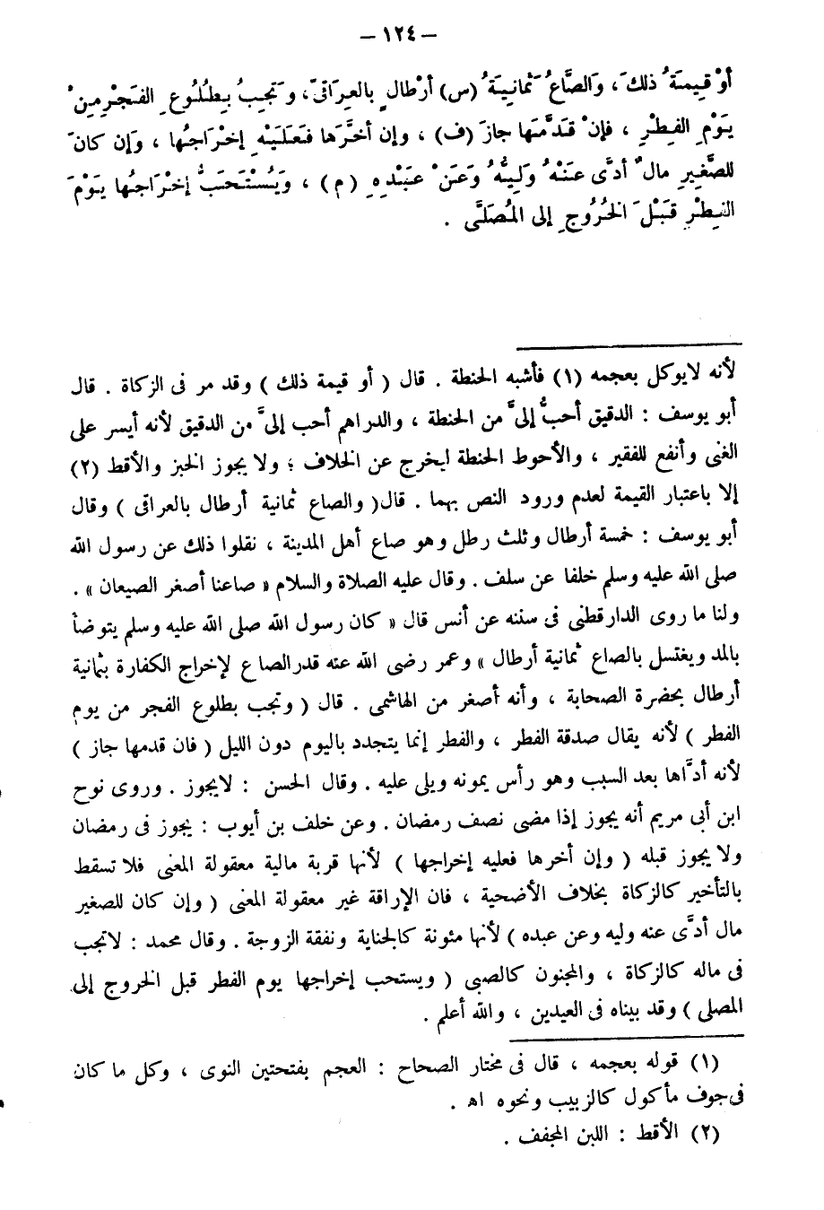 أَوْ قِيمَةُ ذَلِكَ، وَالصَّاعُ ثَمَانِيَةُ (س) أَرْطَالٍ بِالْعِرَاقِيِّ، وَتَجِبُ بِطُلُوعِ الْفَجْرِ مِنْ يَوْمِ الْفِطْرِ، فَإِنْ قَدَّمَهَا جَازَ (ف) ، وَإِنْ أَخَّرَهَا فَعَلَيْهِ إِخْرَاجُهَا، وَإِنْ كَانَ لِلصَّغِيرِ مَالٌ أَدَّى عَنْهُ وَلَيُّهُ وَعَنْ عَبْدِهِ (م) ، وَيُسْتَحَبُّ إِخْرَاجُهَا يَوْمَ الْفِطْرِ قَبْلَ الْخُرُوجِ إِلَى الْمُصَلَّى.