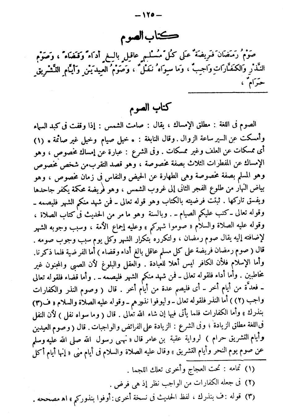 كِتَابُ الصَّوْمِ صَوْمُ رَمَضَانَ فَرِيضَةٌ عَلَى كُلِّ مُسْلِمٍ عَاقِلٍ بَالِغٍ أَدَاءً وَقَضَاءً، وَصَوْمُ النَّذْرِ وَالْكَفَّارَاتِ وَاجِبٌ، وَمَا سِوَاهُ نَفْلٌ، وَصَوْمُ الْعِيدَيْنِ وَأَيَّامِ التَّشْرِيقِ حَرَامٌ،