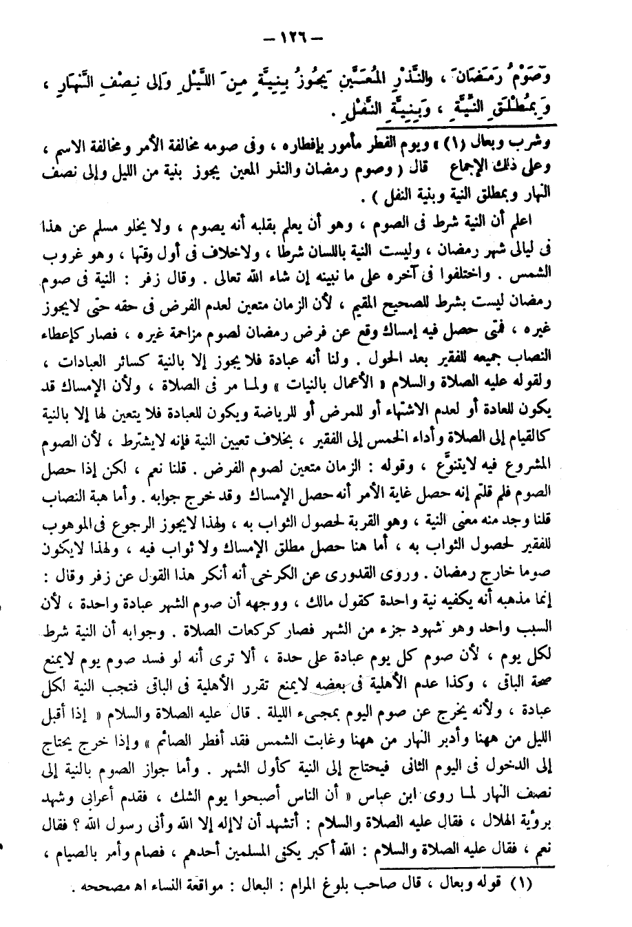 وَأَمَّا جَوَازُ الصَّوْمِ بِالنِّيَّةِ إِلَى نِصْفِ النَّهَارِ لِمَا رَوَى ابْنُ عَبَّاسٍ «أَنَّ النَّاسَ أَصْبَحُوا يَوْمَ الشَّكِّ، فَقَدِمَ أَعْرَابِيٌّ وَشَهِدَ بِرُؤْيَةِ الْهِلَالِ، فَقَالَ - عَلَيْهِ الصَّلَاةُ وَالسَّلَامُ -: " أَتَشْهَدُ أَنْ لَا إِلَهَ إِلَّا اللَّهُ وَأَنِّي رَسُولُ اللَّهِ؟ " فَقَالَ: نَعَمْ، فَقَالَ - عَلَيْهِ الصَّلَاةُ وَالسَّلَامُ -: " اللَّهُ أَكْبَرُ، يَكْفِي الْمُسْلِمِينَ أَحَدُهُمْ " فَصَامَ، وَأَمَرَ بِالصِّيَامِ،