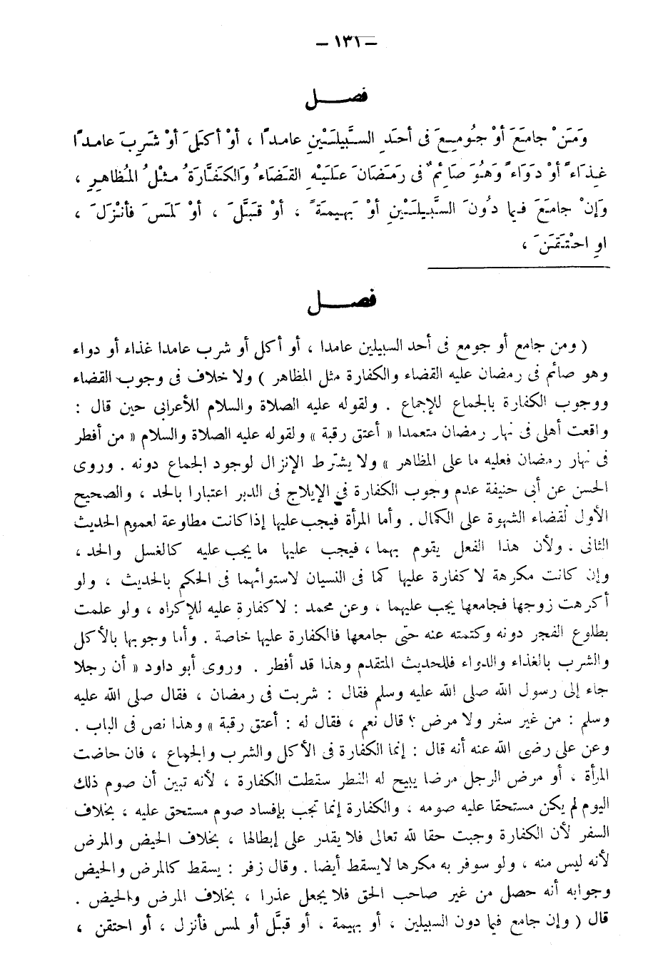 فَصْلٌ وَمَنْ جَامَعَ أَوْ جُومِعَ فِي أَحَدِ السَّبِيلَيْنِ عَامِدًا، أَوْ أَكَلَ أَوْ شَرِبَ عَامِدًا غِذَاءً أَوْ دَوَاءً وَهُوَ صَائِمٌ فِي رَمَضَانَ عَلَيْهِ الْقَضَاءُ وَالْكَفَّارَةُ مِثْلَ الْمُظَاهِرِ، وَإِنْ جَامَعَ فِيمَا دُونَ السَّبِيلَيْنِ أَوْ بَهِيمَةً، أَوْ قَبَّلَ، أَوْ لَمَسَ فَأَنْزَلَ، أَوِ احْتَقَنَ،