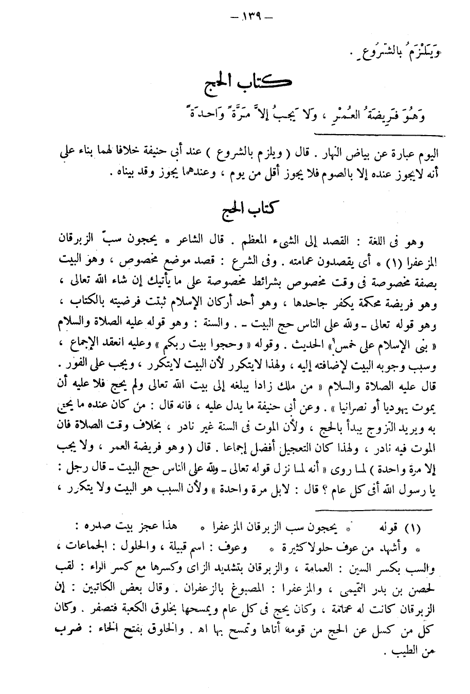 كِتَابُ الْحَجِّ وَهُوَ فَرِيضَةُ الْعُمْرِ، وَلَا يَجِبُ إِلَّا مَرَّةً وَاحِدَةً