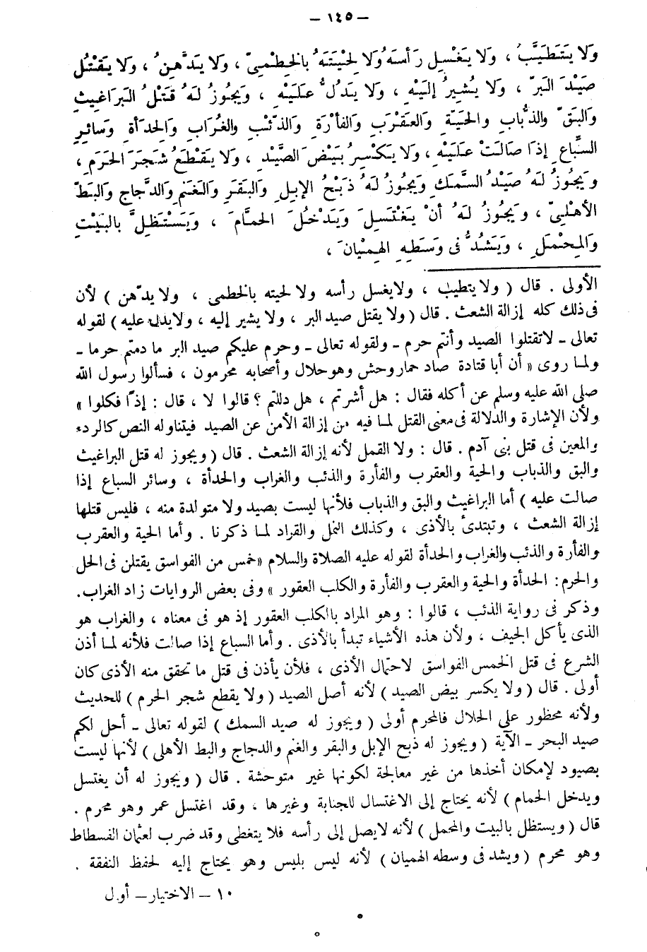 قَالَ: (وَيَجُوزُ لَهُ قَتْلُ الْبَرَاغِيثِ وَالْبَقِّ وَالذُّبَابِ وَالْحَيَّةِ وَالْعَقْرَبِ وَالْفَأْرَةِ وَالذِّئْبِ وَالْغُرَابِ وَالْحِدَأَةِ، وَسَائِرِ السِّبَاعِ إِذَا صَالَتْ عَلَيْهِ) أَمَّا الْبَرَاغِيثُ وَالْبَقُّ وَالذُّبَابُ فَلِأَنَّهَا لَيْسَتْ بِصَيْدٍ وَلَا مُتَوَلِّدَةٍ مِنْهُ، فَلَيْسَ قَتْلُهَا إِزَالَةَ الشَّعَثِ، وَتَبْتَدِئُ بِالْأَذَى، وَكَذَلِكَ النَّمْلُ وَالْقُرَادُ لِمَا ذَكَرْنَا، وَأَمَّا الْحَيَّةُ وَالْعَقْرَبُ وَالْفَأْرَةُ وَالذِّئْبُ وَالْغُرَابُ وَالْحِدَأَةُ لِقَوْلِهِ - عَلَيْهِ الصَّلَاةُ وَالسَّلَامُ -: «خَمْسٌ مِنَ الْفَوَاسِقِ يُقْتَلْنَ فِي الْحِلِّ وَالْحَرَمِ: الْحِدَأَةُ وَالْحَيَّةُ وَالْعَقْرَبُ وَالْفَأْرَةُ وَالْكَلْبُ الْعَقُورُ» وَفِي بَعْضِ الرِّوَايَاتِ زَادَ الْغُرَابَ. وَذُكِرَ فِي رِوَايَةٍ الذِّئْبُ، قَالُوا: وَهُوَ الْمُرَادُ بِالْكَلْبِ الْعَقُورِ إِذْ هُوَ فِي مَعْنَاهُ، وَالْغُرَابُ هُوَ الَّذِي يَأْكُلُ الْجِيَفَ، وَلِأَنَّ هَذِهِ الْأَشْيَاءَ تَبْدَأُ بِالْأَذَى.