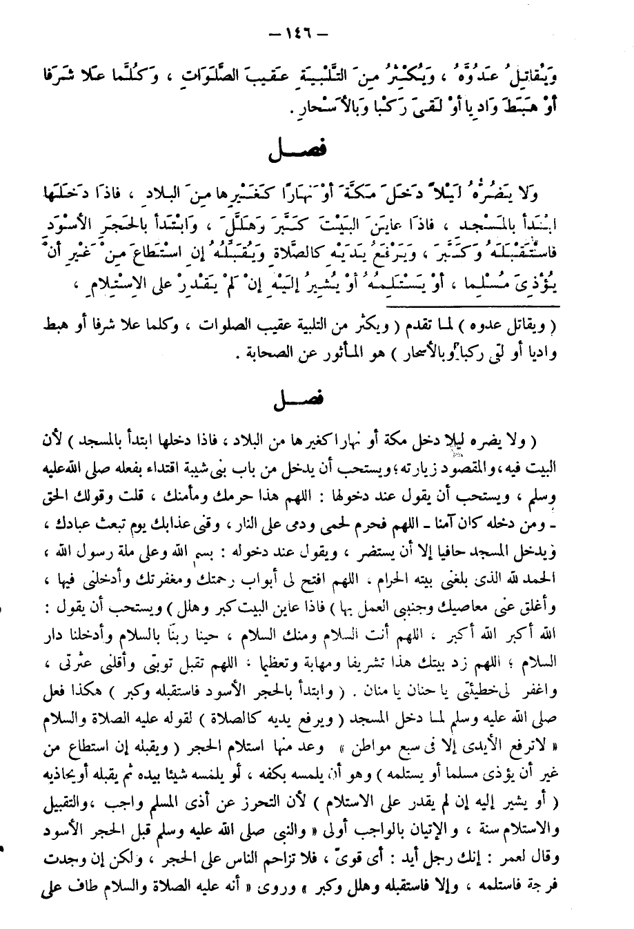 فَصْلٌ (وَلَا يَضُرُّهُ لَيْلًا دَخْلَ مَكَّةَ أَوْ نَهَارًا كَغَيْرِهَا مِنَ الْبِلَادِ، فَإِذَا دَخَلَهَا ابْتَدَأَ بِالْمَسْجِدِ) لِأَنَّ الْبَيْتَ فِيهِ، وَالْمَقْصُودُ زِيَارَتُهُ ; وَيُسْتَحَبُّ أَنْ يَدْخُلَ مِنْ بَابِ بَنِي شَيْبَةَ اقْتِدَاءً بِفِعْلِهِ - صَلَّى اللَّهُ عَلَيْهِ وَسَلَّمَ - وَيُسْتَحَبُّ أَنْ يَقُولَ عِنْدَ دُخُولِهَا: اللَّهُمَّ هَذَا حَرَمُكَ وَمَأْمَنُكَ، قُلْتَ - وَقَوْلُكَ الْحَقُّ -: {وَمَنْ دَخَلَهُ كَانَ آمِنًا} [آل عمران: 97] اللَّهُمَّ فَحَرِّمْ لَحْمِي وَدَمِي عَلَى النَّارِ، وَقِنِي عَذَابَكَ يَوْمَ تَبْعَثُ عِبَادَكَ، وَيَدْخُلُ الْمَسْجِدَ حَافِيًا إِلَّا أَنْ يَسْتَضِرَّ، وَيَقُولُ عِنْدَ دُخُولِهِ: بِسْمِ اللَّهِ وَعَلَى مِلَّةِ رَسُولِ اللَّهِ، الْحَمْدُ لِلَّهِ الَّذِي بَلَّغَنِي بَيْتَهُ الْحَرَامَ. اللَّهُمَّ افْتَحْ لِي أَبْوَابَ رَحْمَتِكَ وَمَغْفِرَتِكَ وَأَدْخِلْنِي فِيهَا، وَأَغْلِقْ عَنِّي مَعَاصِيَكَ وَجَنِّبْنِي الْعَمَلَ بِهَا. (فَإِذَا عَايَنَ الْبَيْتَ كَبَّرَ وَهَلَّلَ) وَيُسْتَحَبُّ أَنْ يَقُولَ: اللَّهُ أَكْبَرُ، اللَّهُ أَكْبَرُ، اللَّهُمَّ أَنْتَ السَّلَامُ وَمِنْكَ السَّلَامُ، حَيِّنَا رَبَّنَا بِالسَّلَامِ، وَأَدْخِلْنَا دَارَ السَّلَامِ، اللَّهُمَّ زِدْ بَيْتَكَ هَذَا تَشْرِيفًا وَمَهَابَةً وَتَعْظِيمًا، اللَّهُمَّ تَقَبَّلَ تَوْبَتِي وَأَقِلْنِي عَثْرَتِي، وَاغْفِرْ لِي خَطِيئَتِي يَا حَنَّانُ يَا مَنَّانُ.