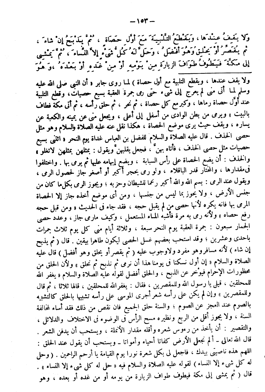 وَلَا يَقِفْ عِنْدَهَا وَيَقْطَعُ التَّلْبِيَةَ مَعَ أَوَّلِ حَصَاةٍ، ثُمَّ يَذْبَحُ إِنْ شَاءَ، ثُمَّ يُقَصِّرُ أَوْ يَحْلِقُ وَهُوَ أَفْضَلُ، وَحَلَّ لَهُ كُلُّ شَيْءً إِلَّا النِّسَاءَ، ثُمَّ يَمْشِي إِلَى مَكَّةَ فَيَطُوفُ طَوَافَ الزِّيَارَةِ مِنْ يَوْمِهِ أَوْ مِنْ غَدِهِ أَوْ بَعْدَهُ، وَهُوَ