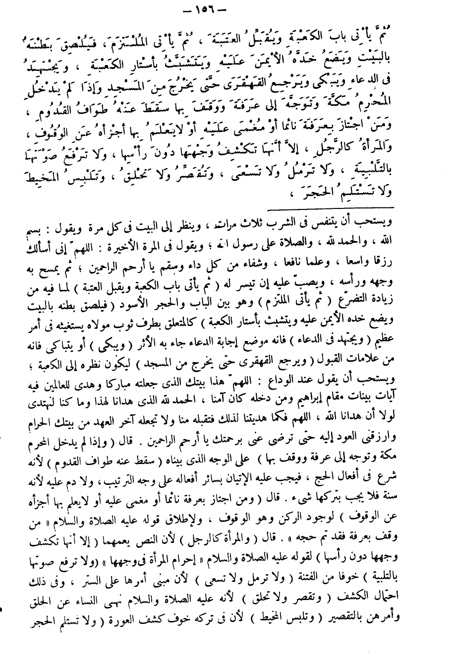 ثُمَّ يَأْتِي بَابَ الْكَعْبَةِ وَيُقَبِّلُ الْعَتَبَةَ، ثُمَّ يَأْتِي الْمُلْتَزَمَ، فَيُلْصِقُ بَطْنَهُ بِالْبَيْتِ وَيَضَعُ خَدَّهُ الْأَيْمَنَ عَلَيْهِ وَيَتَشَبَّثُ بِأَسْتَارِ الْكَعْبَةِ، وَيَجْتَهِدُ فِي الدُّعَاءِ وَيَبْكِي وَيَرْجِعُ الْقَهْقَرَى حَتَّى يَخْرُجَ مِنَ الْمَسْجِدِ، وَإِذَا لَمْ يَدْخُلِ الْمُحْرِمُ مَكَّةَ وَتَوَجَّهَ إِلَى عَرَفَةَ وَوَقَفَ بِهَا سَقَطَ عَنْهُ طَوَافُ الْقُدُومِ، وَمَنِ اجْتَازَ بِعَرَفَةَ نَائِمًا أَوْ مُغْمًى عَلَيْهِ أَوْ لَا يَعْلَمُ بِهَا أَجْزَأَهُ عَنِ الْوُقُوفِ. وَالْمَرْأَةُ كَالرَّجُلِ، إِلَّا أَنَّهَا تَكْشِفُ وَجْهَهَا دُونَ رَأْسِهَا، وَلَا تَرْفَعُ صَوْتَهَا بِالتَّلْبِيَةِ، وَلَا تَرْمُلُ وَلَا تَسْعَى، وَتُقَصِّرُ وَلَا تَحْلِقُ، وَتَلْبَسُ الْمَخِيطَ وَلَا تَسْتَلِمُ الْحَجَرَ،